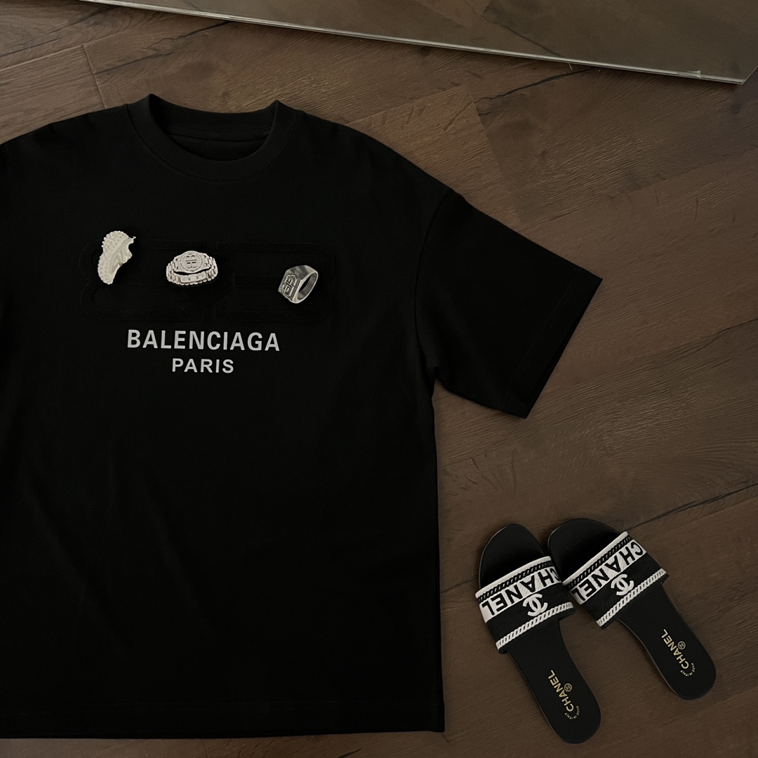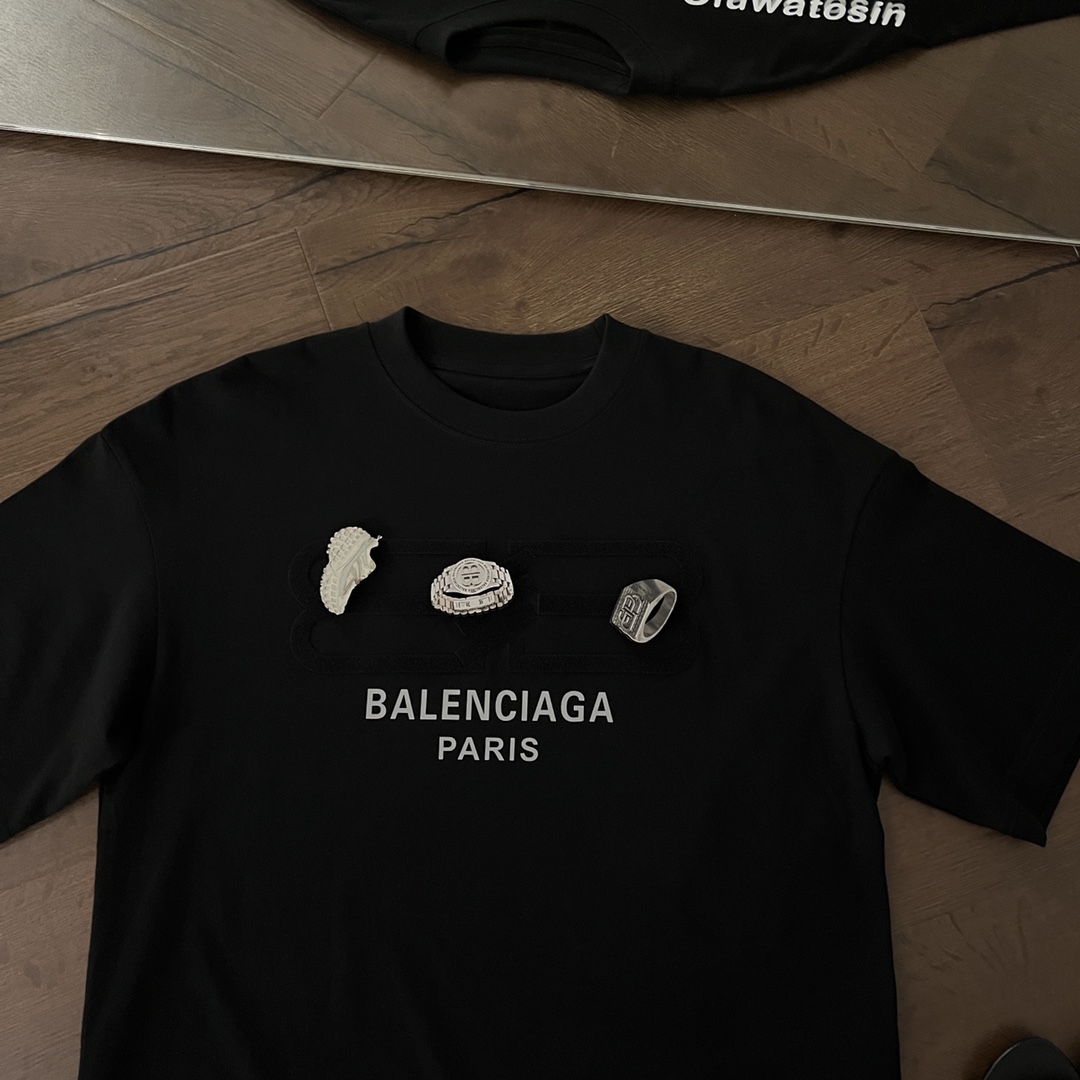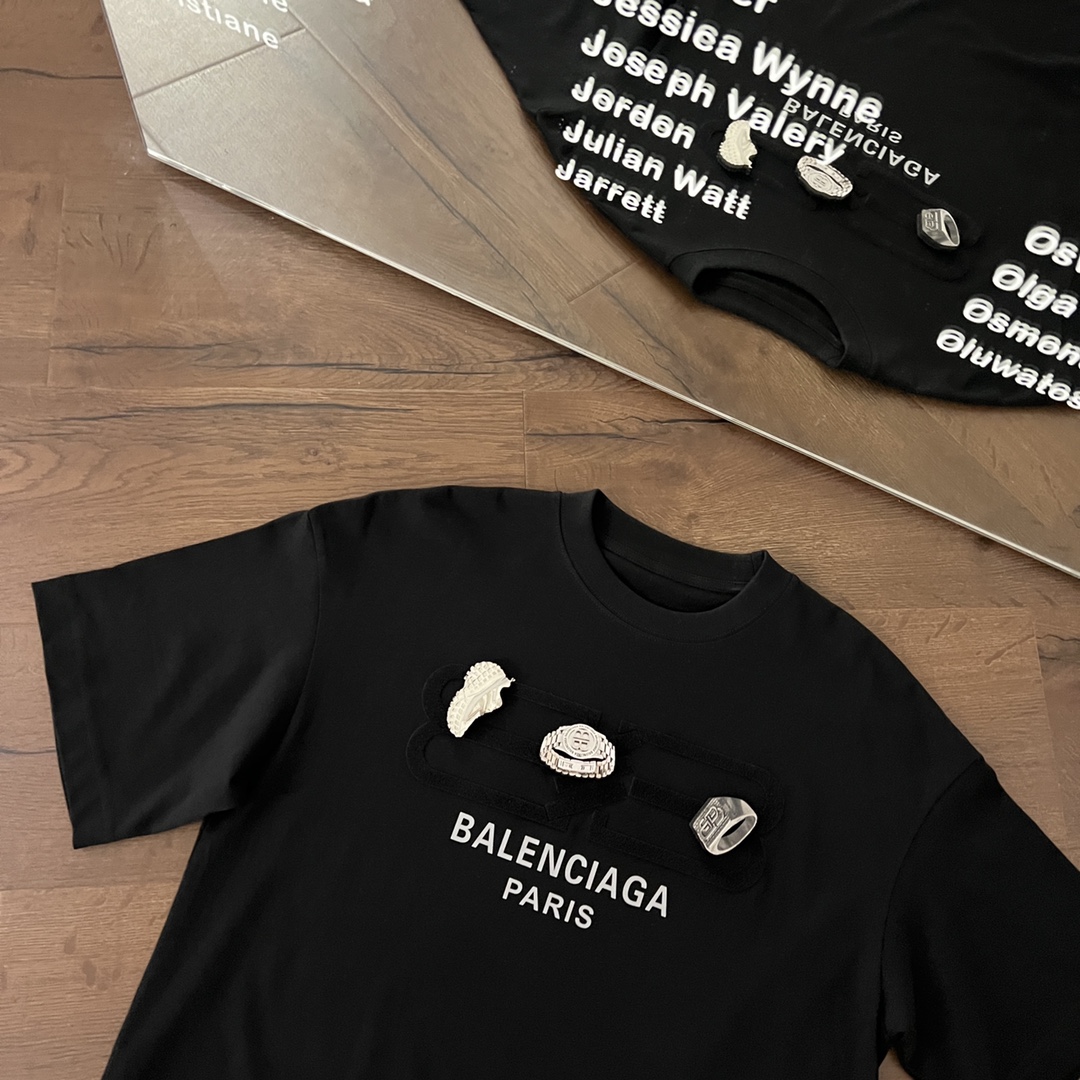 33168 23ss Summer New Style - BALENCIAG* Short Sleeves Three-dimensional Velcro on the chest can be attached and changed positions at will! Really creative, eye-catching, loose fit, lazy and casual, slimming, same style for men and women, casual wear