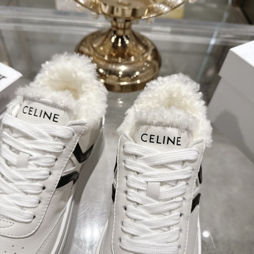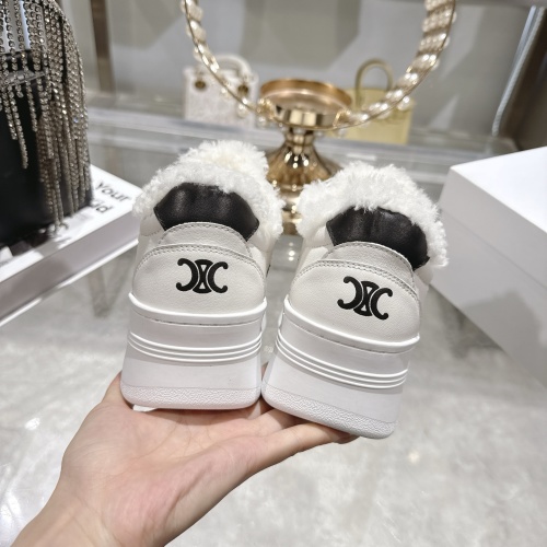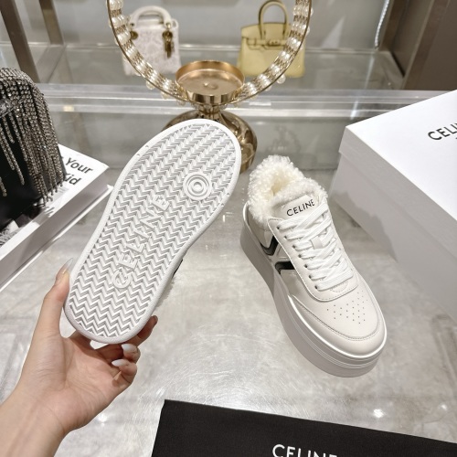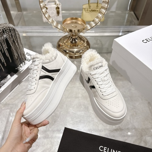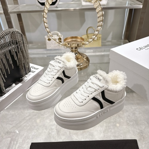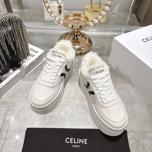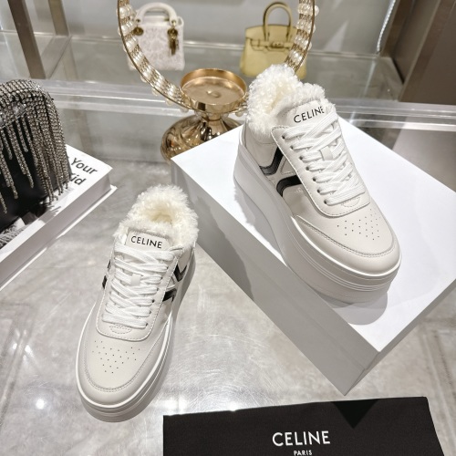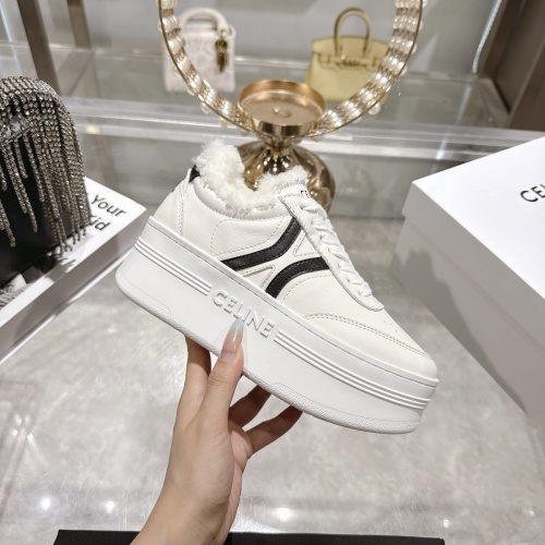 Celine 2025SS Logo Lace-Up Platform Wool-Lined White Sneakers,Street Style