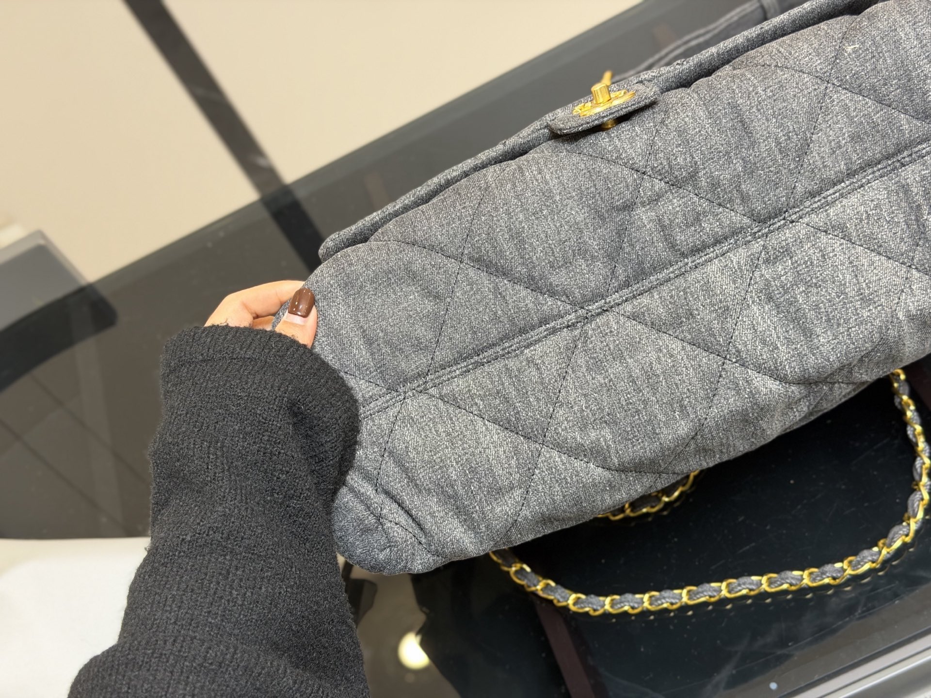 Elevate your style with the Chanel 22 handbag. Crafted in denim with a quilted pattern and gold-tone metal chain, it's both cool and chic. Size: 40 x 26 cm.