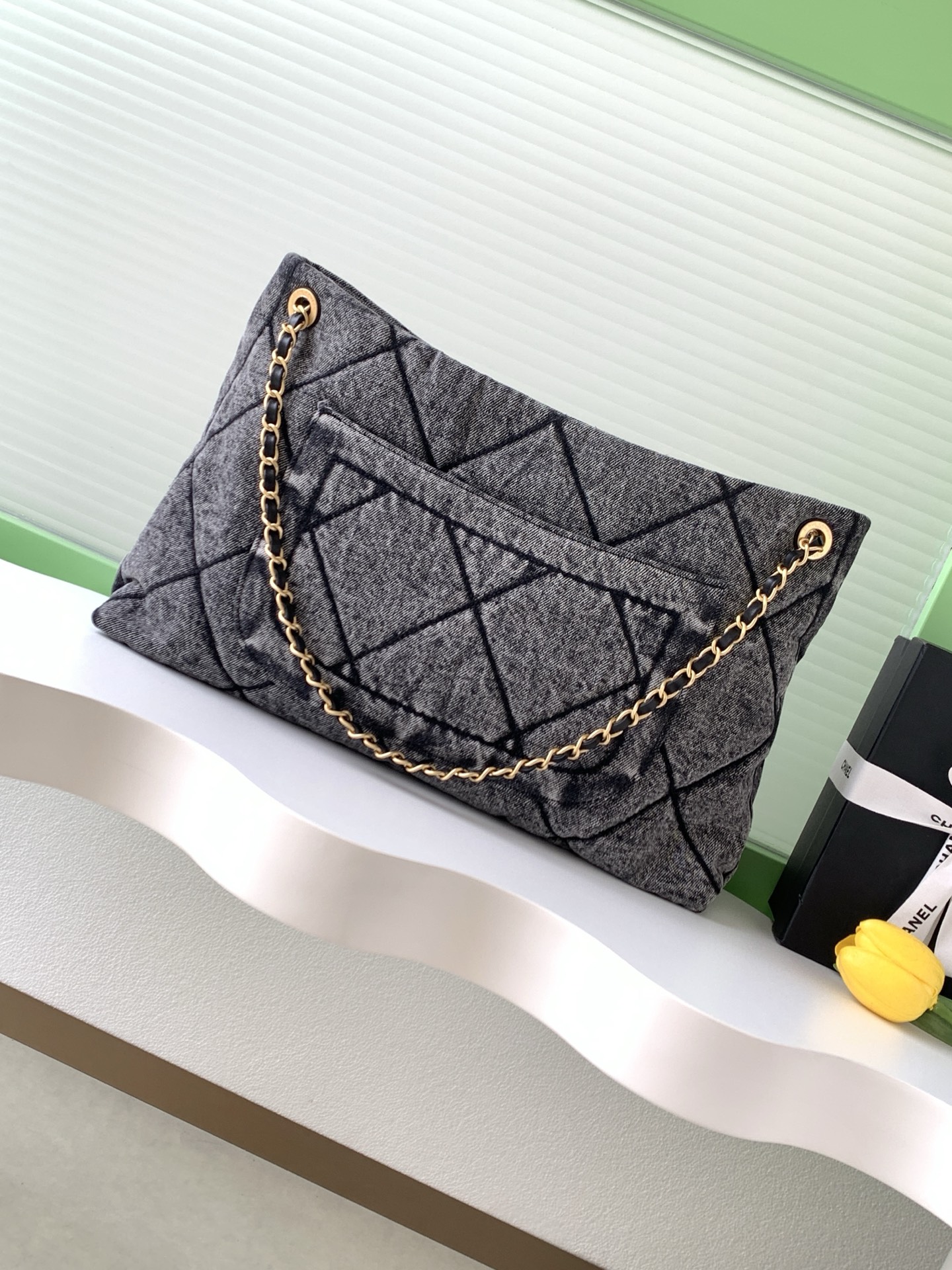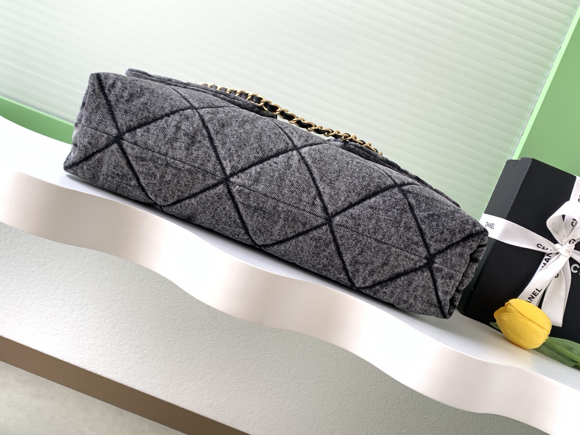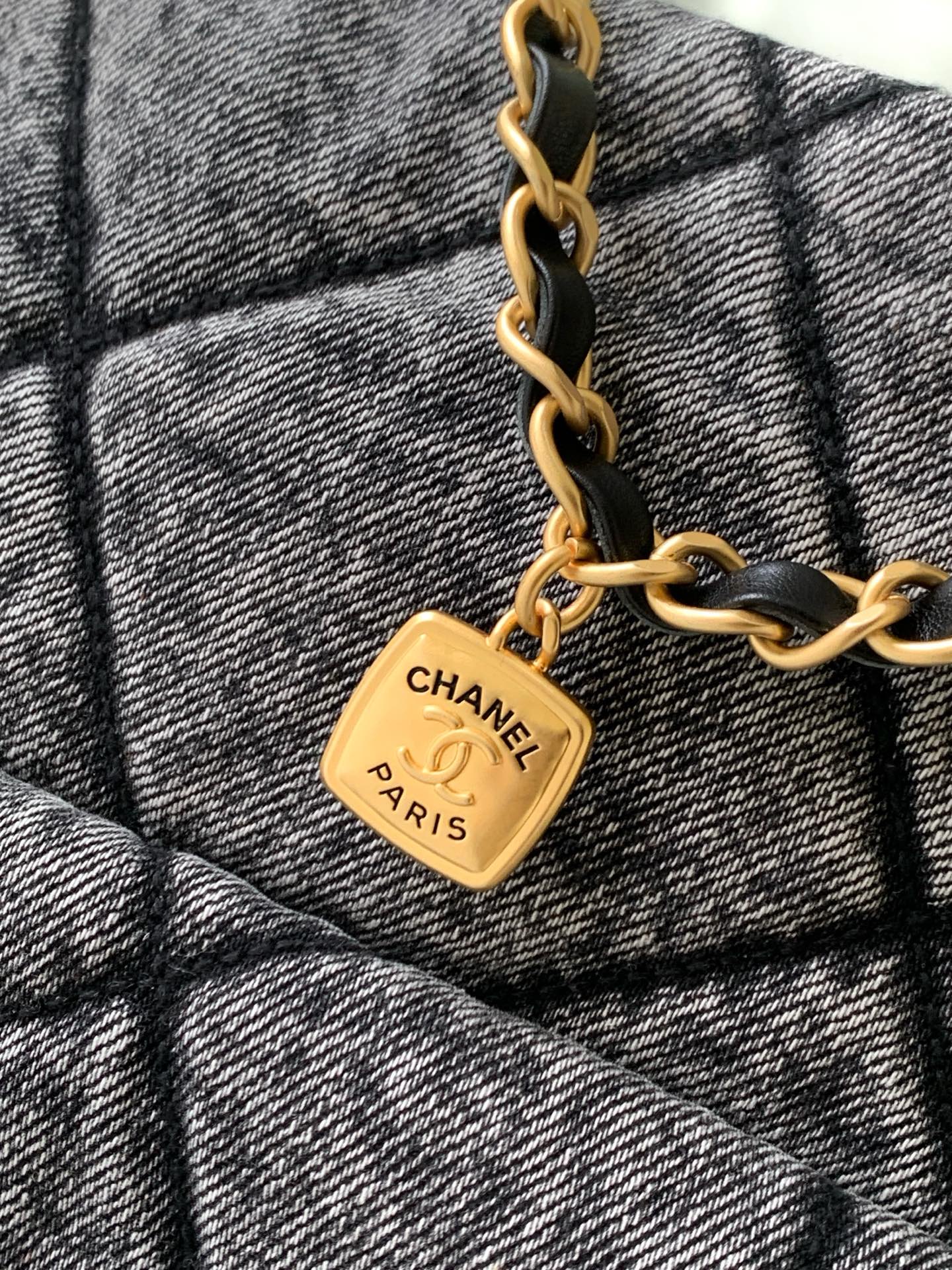 Tags: Chain Shoulder Bag, Chanel Flap Bag, Designer Shoulder Bag, Gray Denim Bag, Luxury Handbag, Quilted Denim Bag