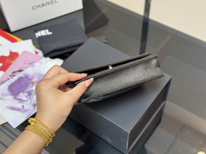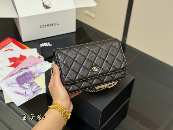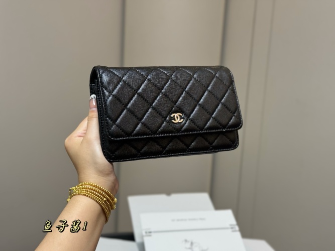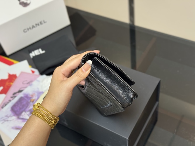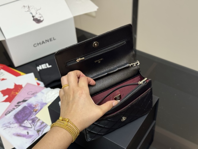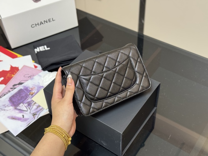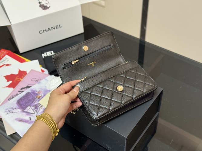 The Chanel Wallet on Chain (WOC) in classic black caviar leather is the perfect blend of luxury and practicality. This compact bag is designed for the modern woman who values both style and function.