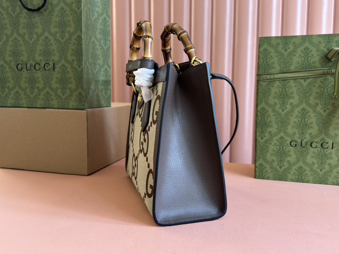 Tags: Brown Leather Handbag, Designer Top Handle Bag, GG Monogram Bag, Gucci Aria Collection, Gucci Bamboo Bag, Luxury Canvas Handbag
