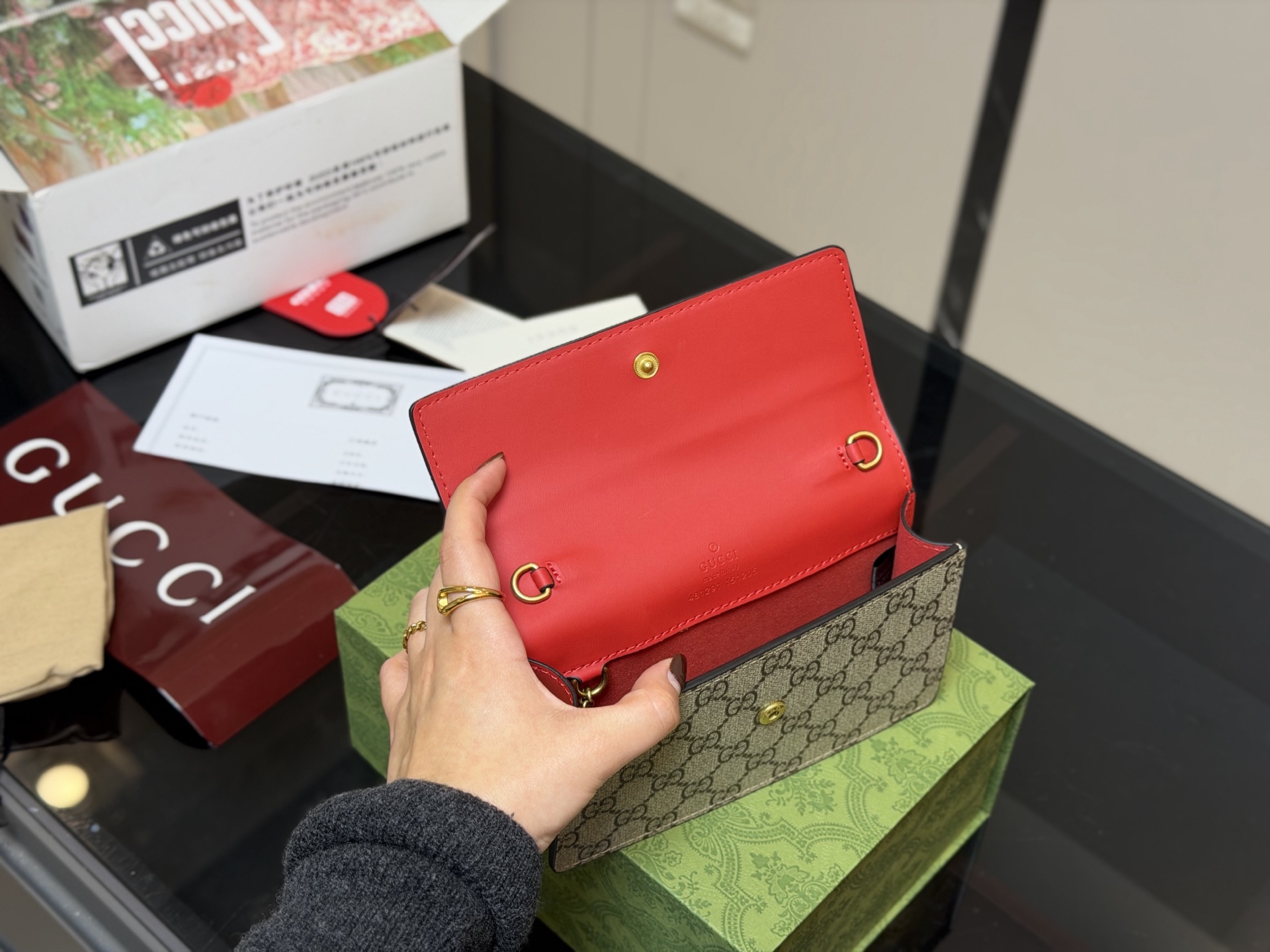 This Gucci Cherry Chain Wallet is a must-have for fashion enthusiasts. Its charming design, compact size, and high-quality craftsmanship make it a standout accessory that complements any outfit.