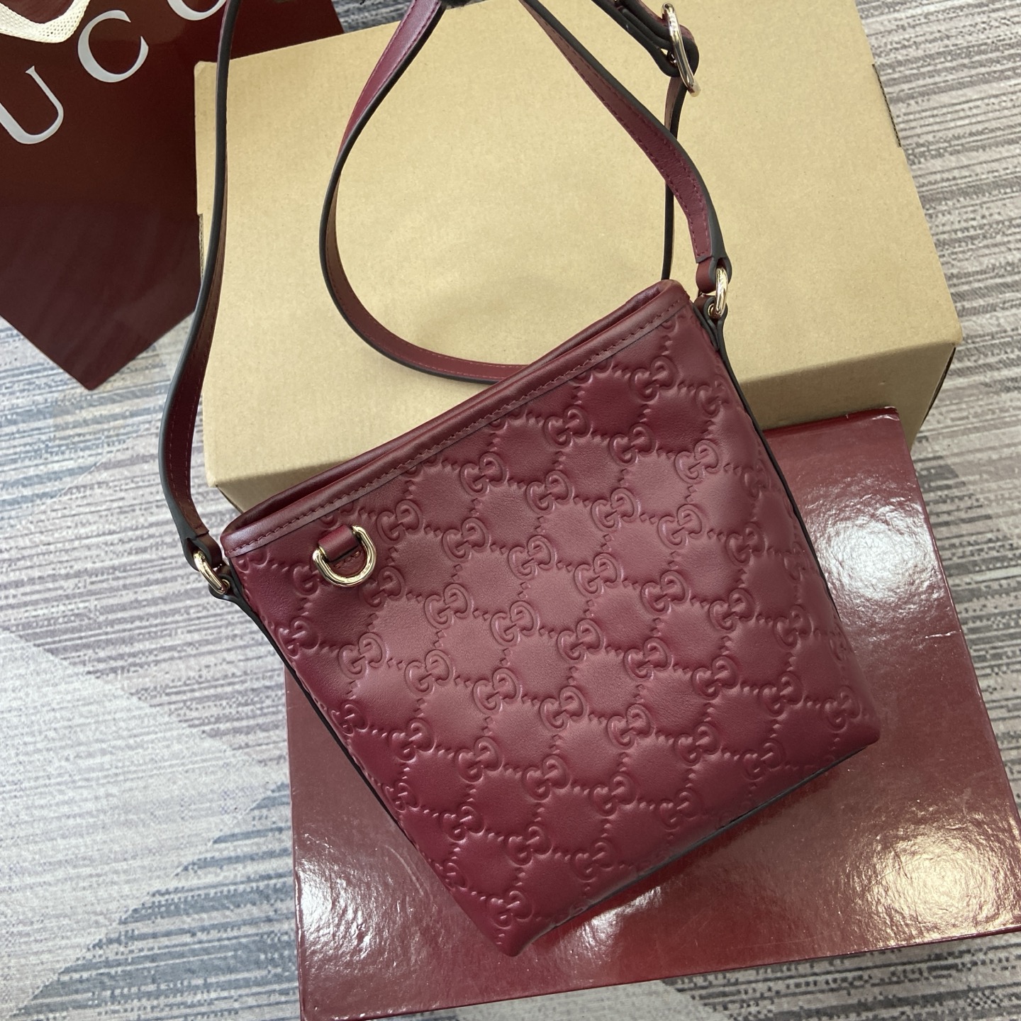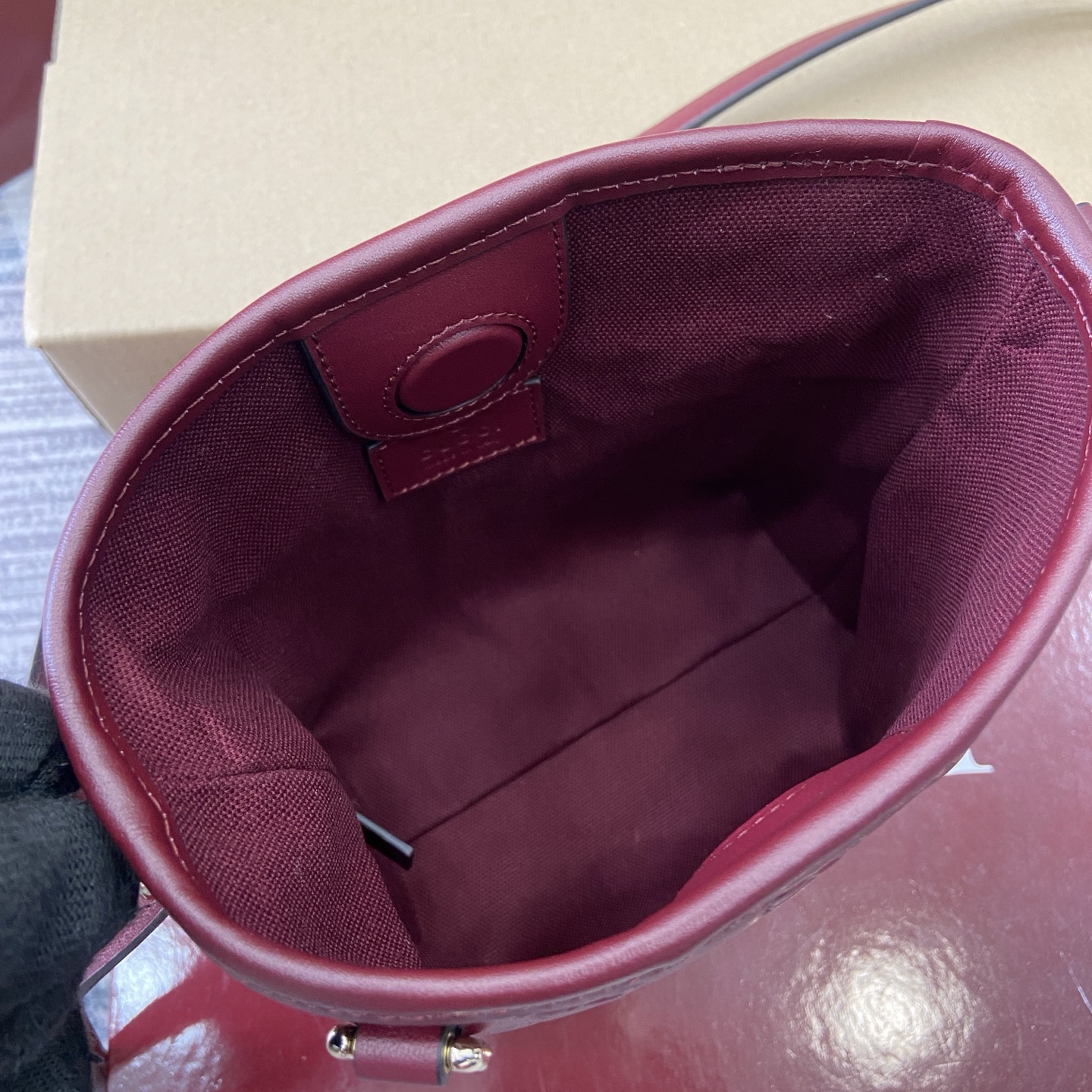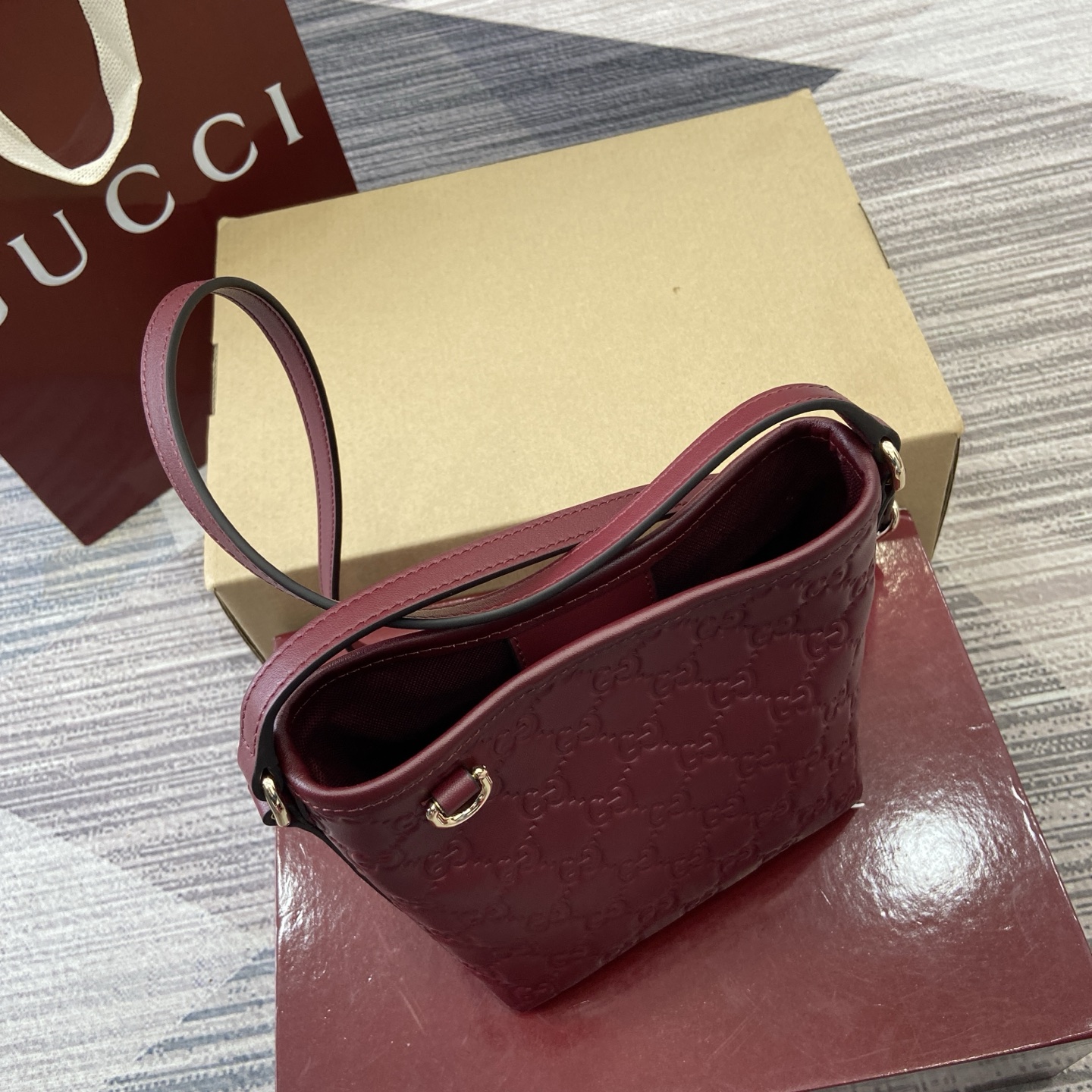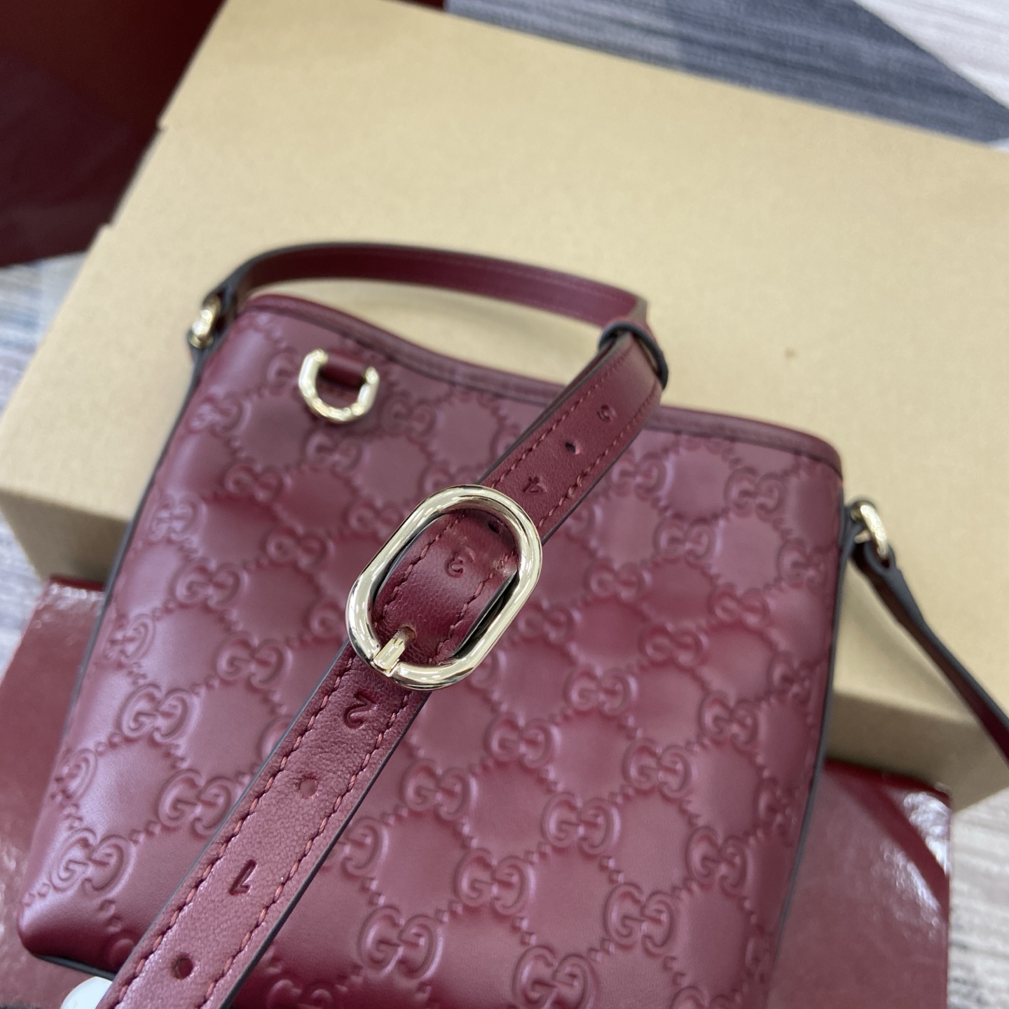 Tags: Designer Bucket Bag, Embossed Leather Bag, Gucci Emblem Bag, Gucci Mini Bucket Bag, Red Leather Shoulder Bag