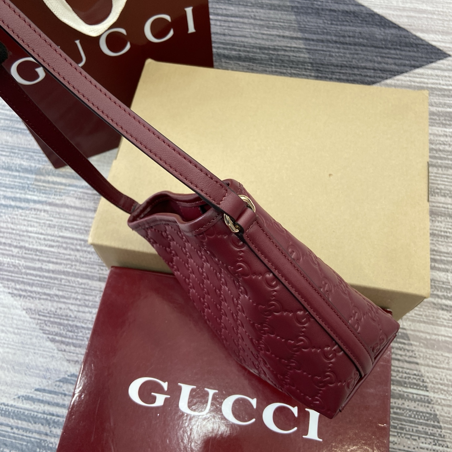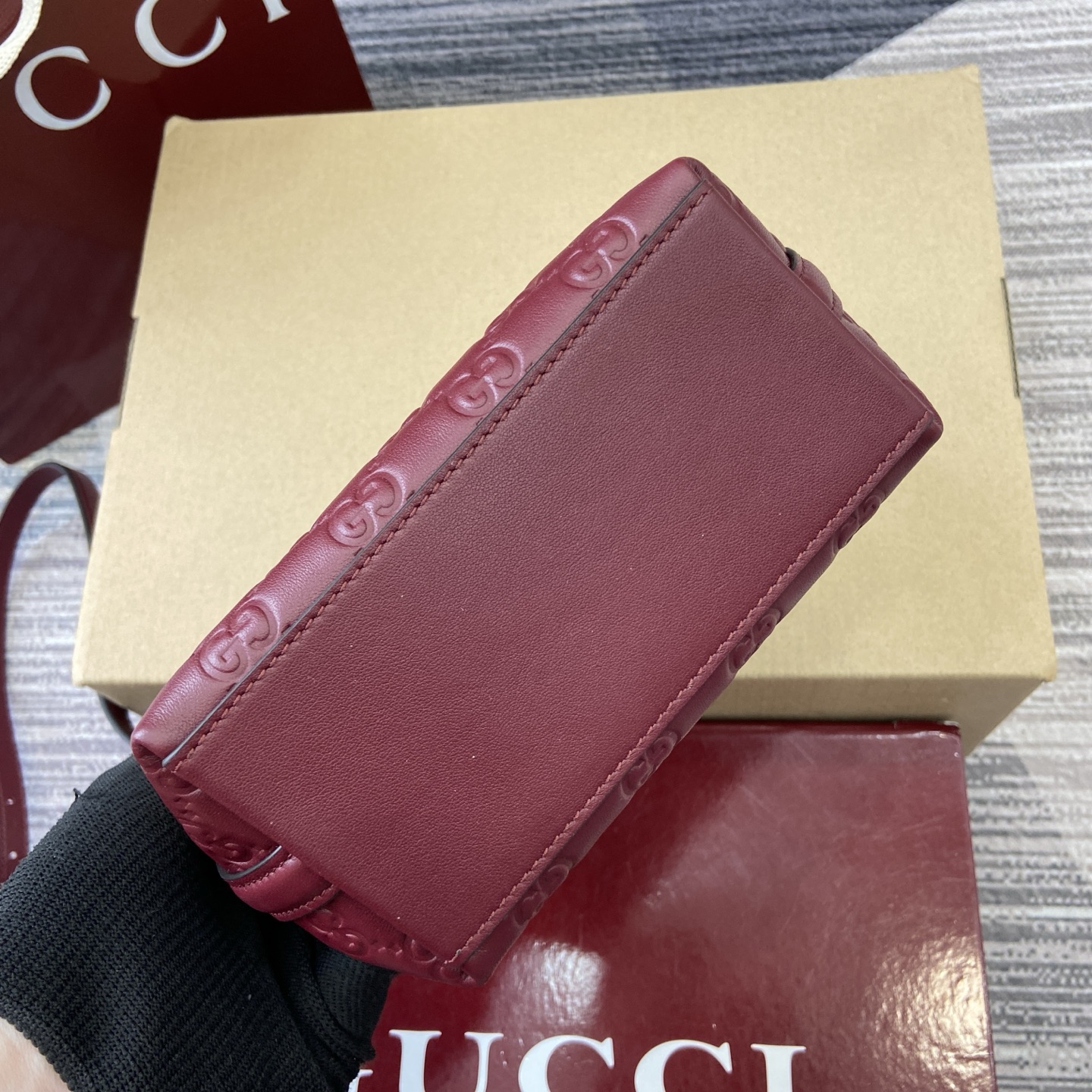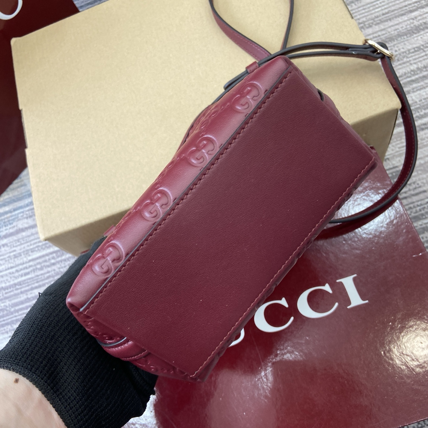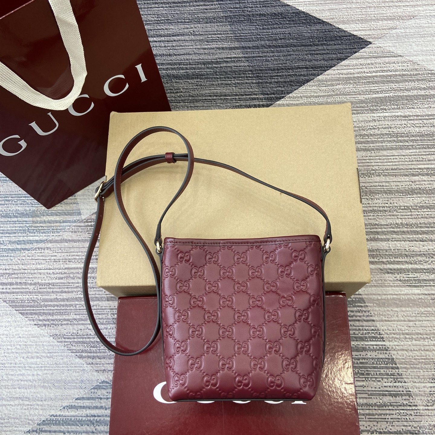 Tags: Designer Bucket Bag, Embossed Leather Bag, Gucci Emblem Bag, Gucci Mini Bucket Bag, Red Leather Shoulder Bag