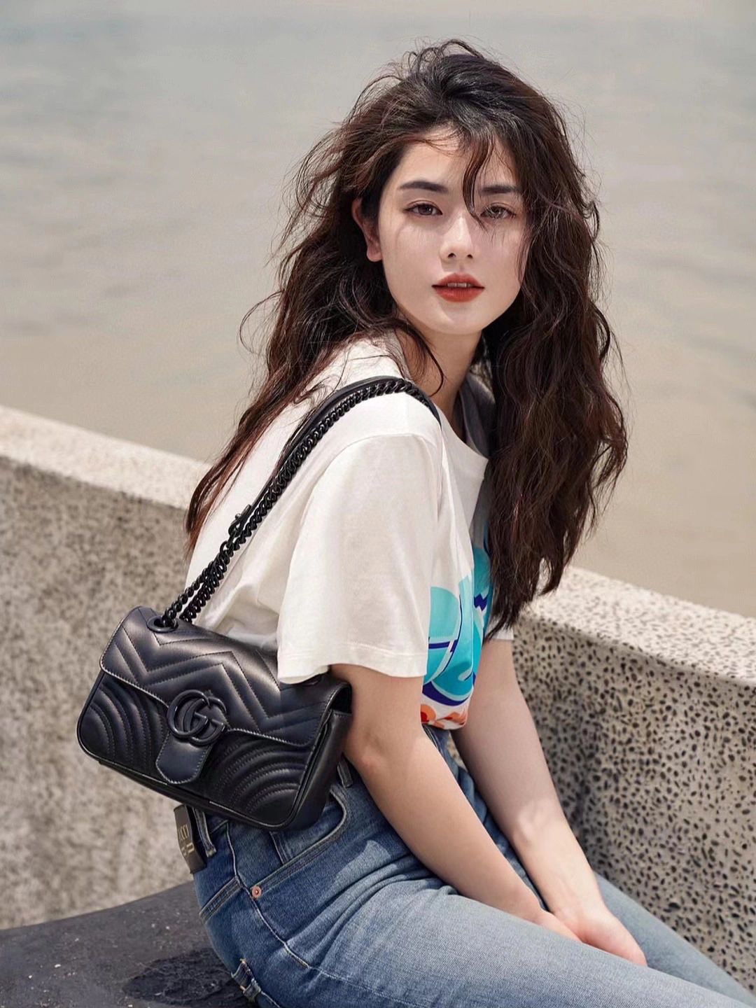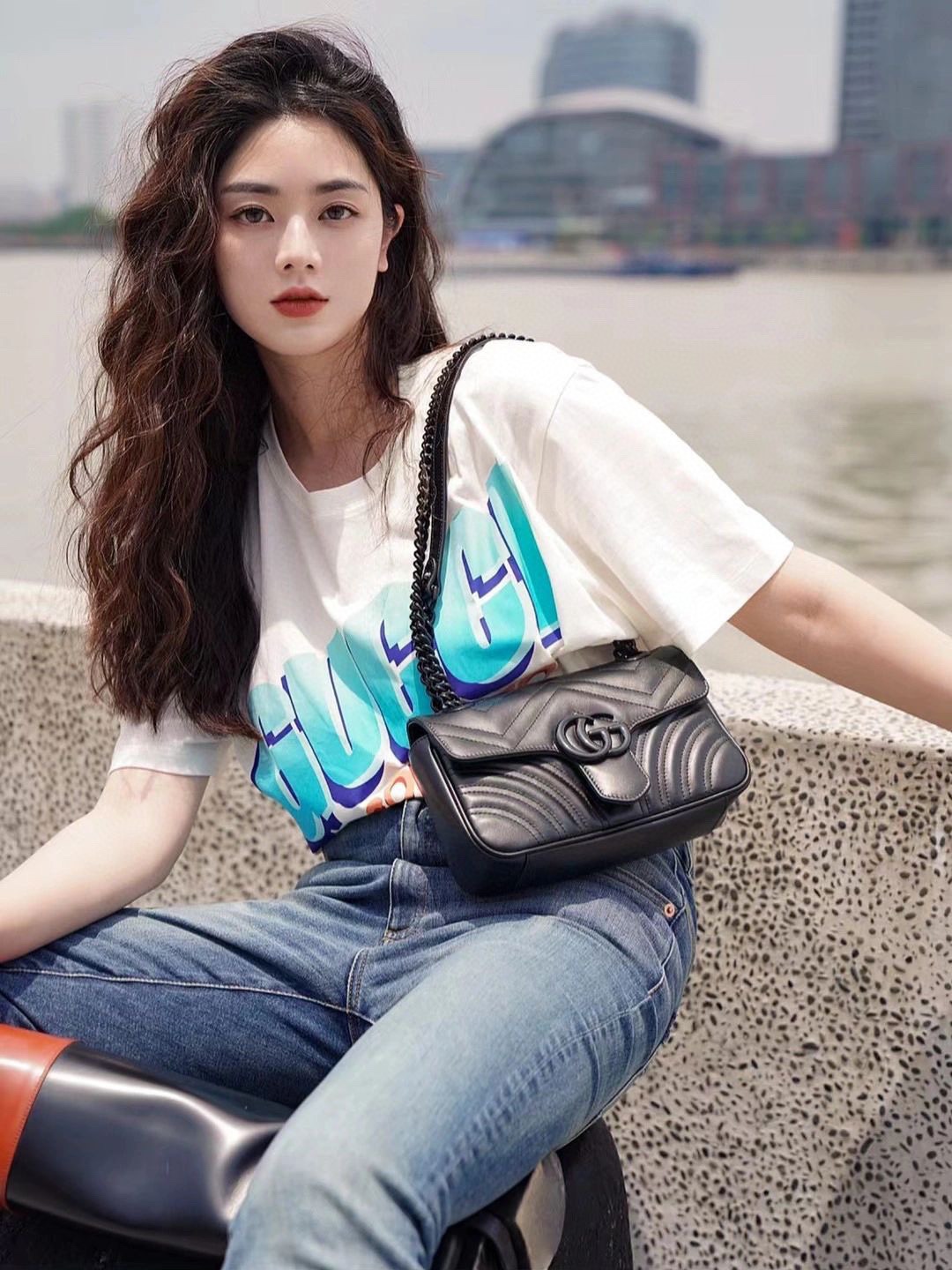 Elegant and romantic after wearing it for a long time, try the handsome and cool style. The classic shape of the GG Marmont pure black handbag on the back is paired with a personalized metal chain and the new double G Logo of the same color gives it a unique fashionable charm. The black is handsome and rustic.
