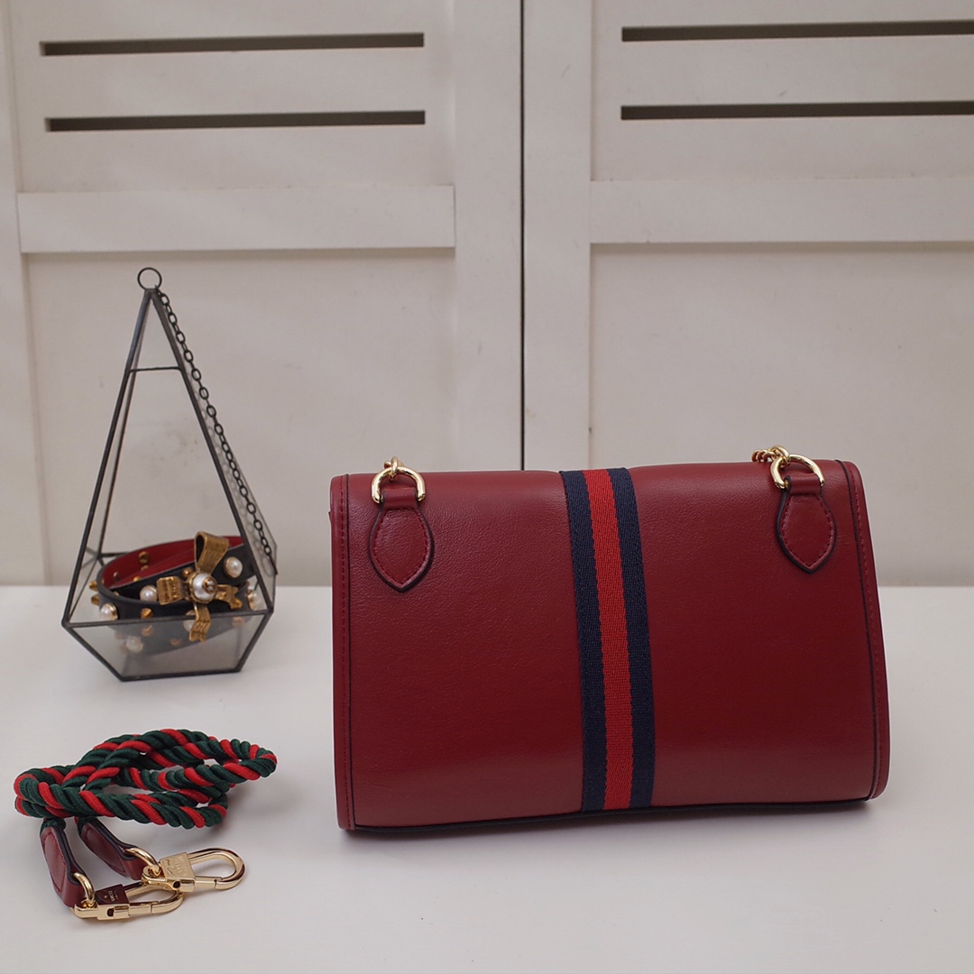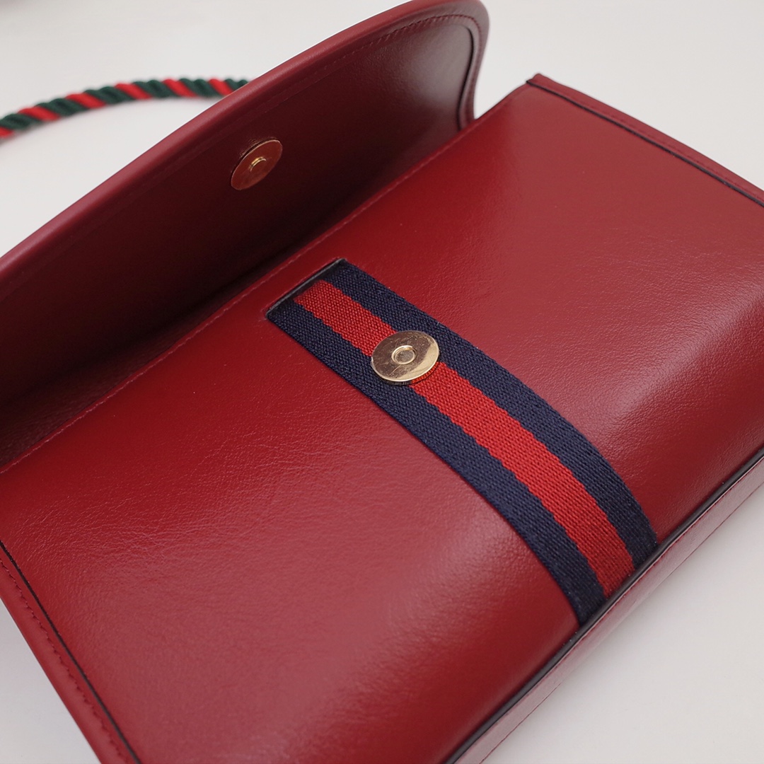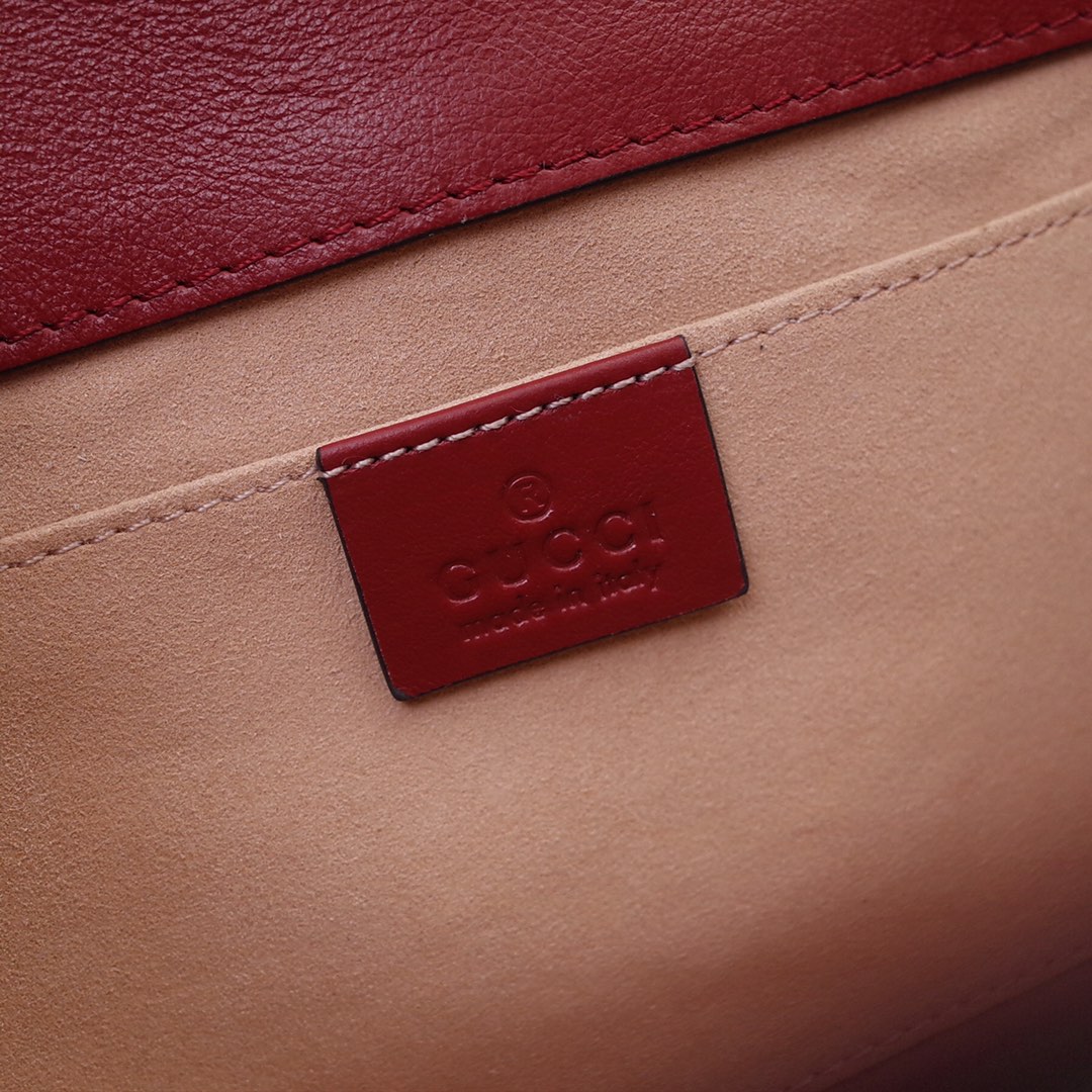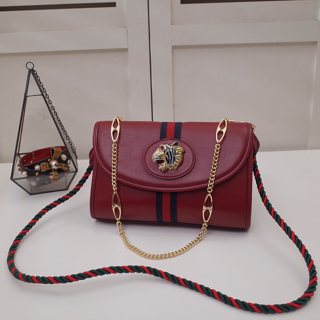 Small Rajah series small shoulder bag. 9612 model number 570145 is a new member of the spring and summer Rajah series. The small leather shoulder bag is embellished with the iconic colorful enamel and crystal tiger head shape of this series. The creative inspiration comes from the collection of jewelry fashion designer Hattie Carnegie in the 1940s. do. The two-strap design features a short chain strap and a long shoulder strap in the brand's signature red and green webbing. Dimensions: length 24x height 16x width 5cm, shipped in red. 1268580