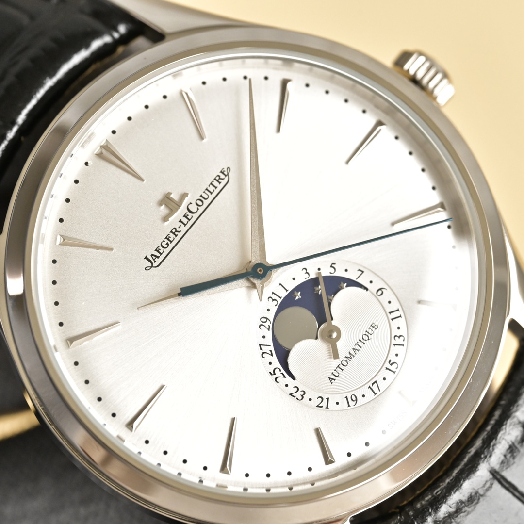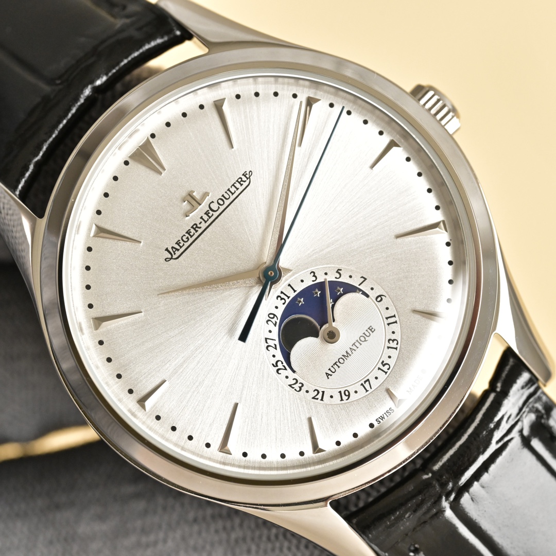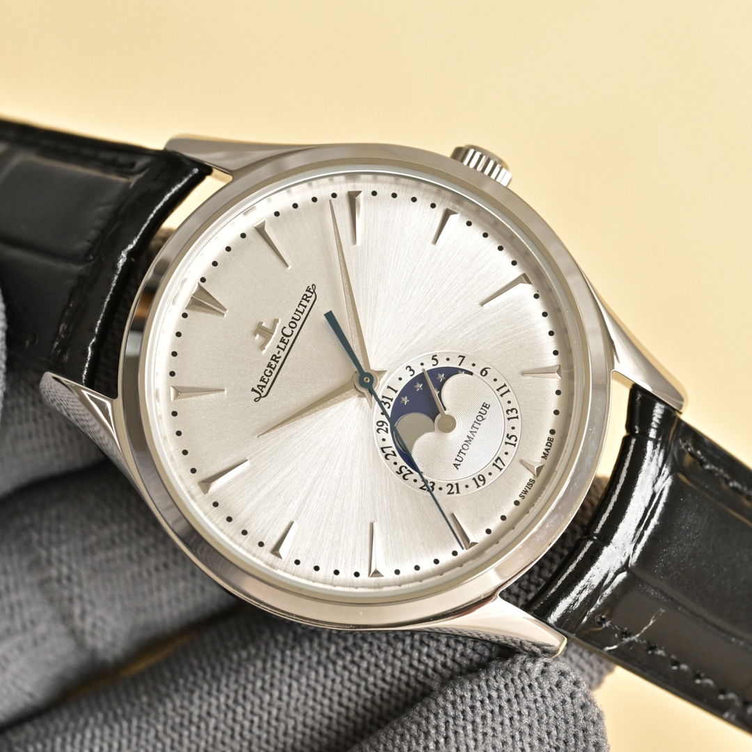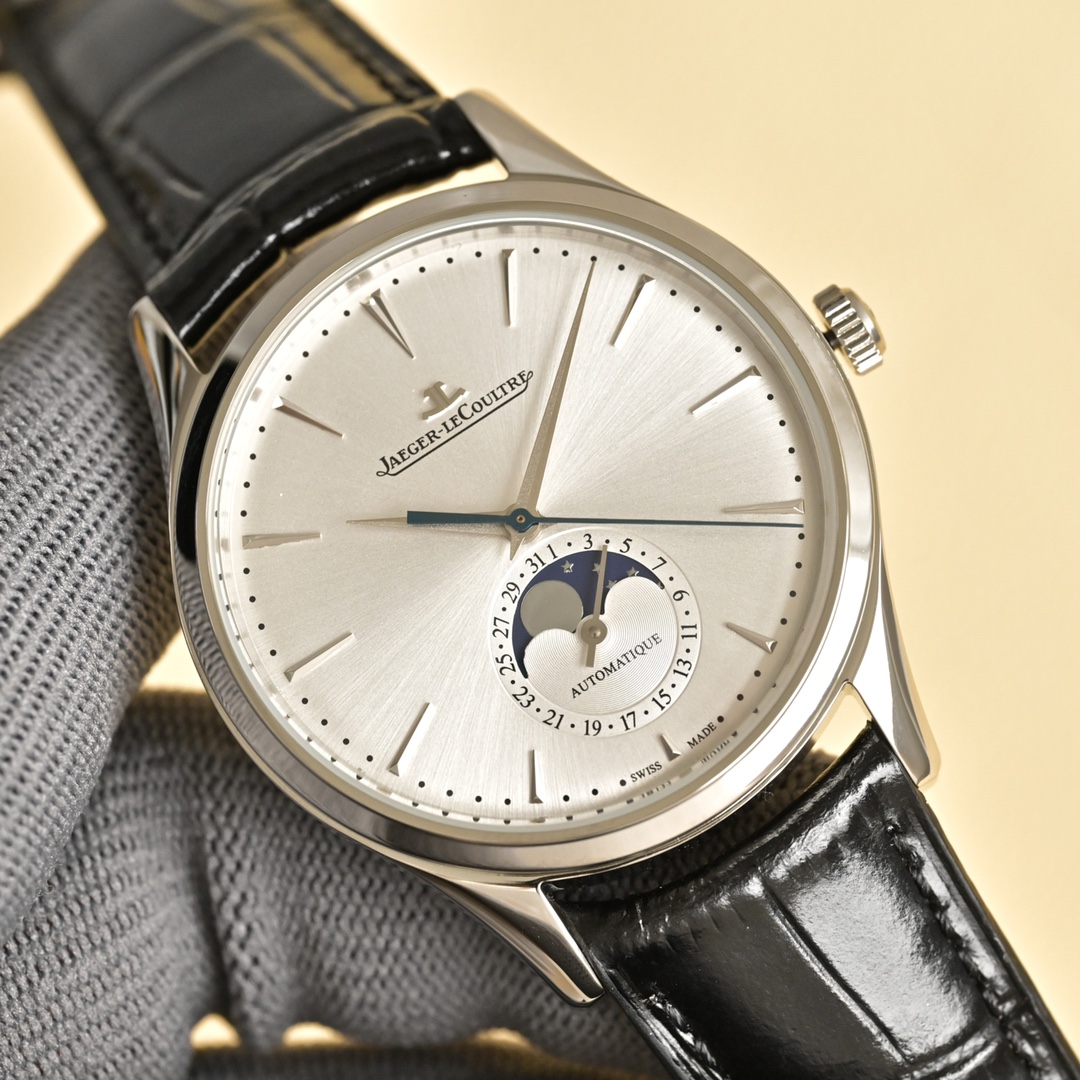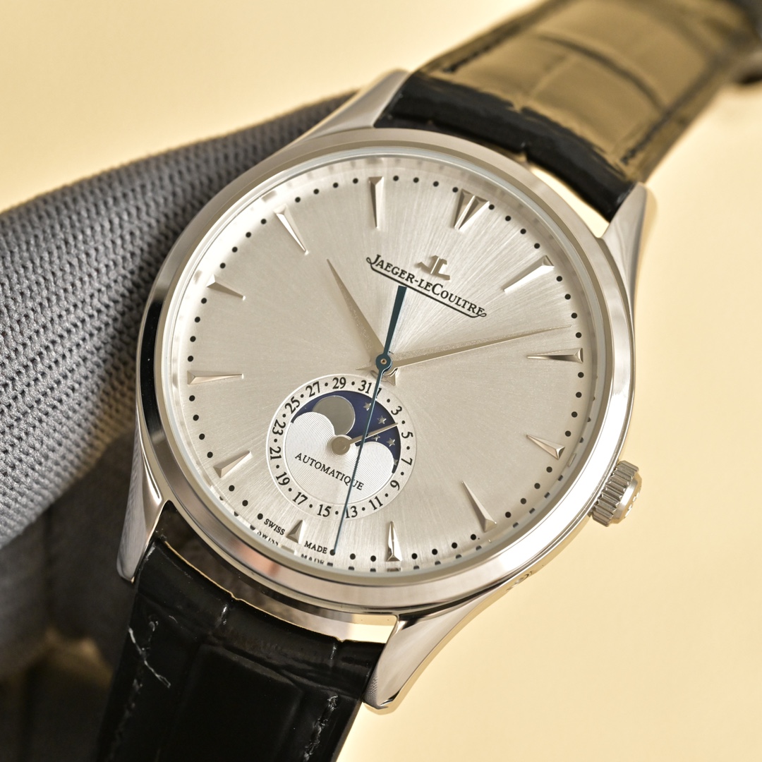 Experience timeless elegance with the Jaeger-LeCoultre Master Moon Phase. Featuring a 39mm case and a sleek black leather strap, it's a masterpiece of horology.