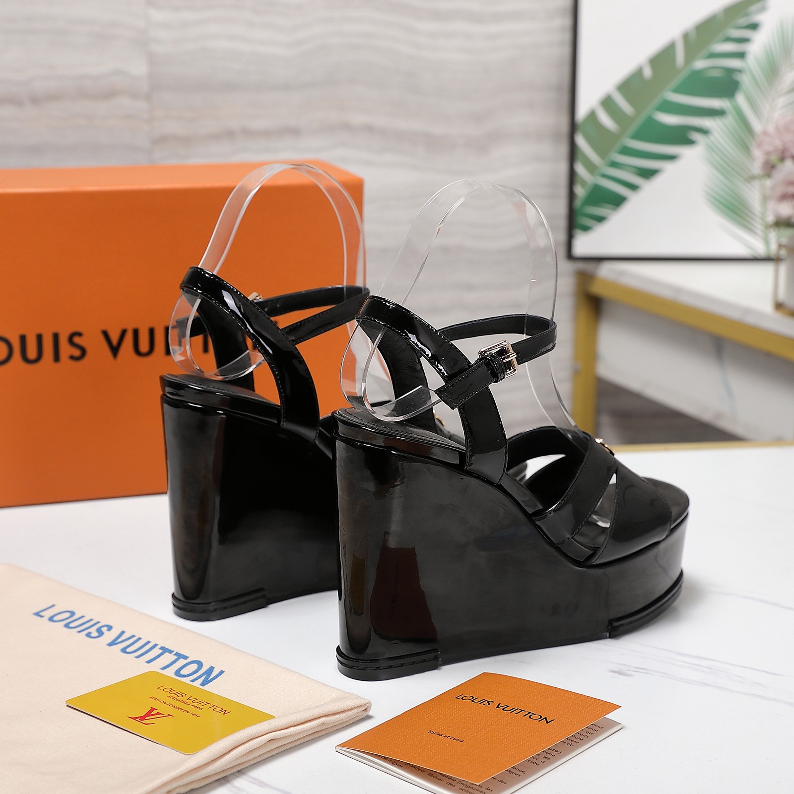 Elevate your style with these Louis Vuitton platform wedge sandals. Featuring a sleek design and comfortable fit, perfect for any occasion. Available in sizes 35-42.