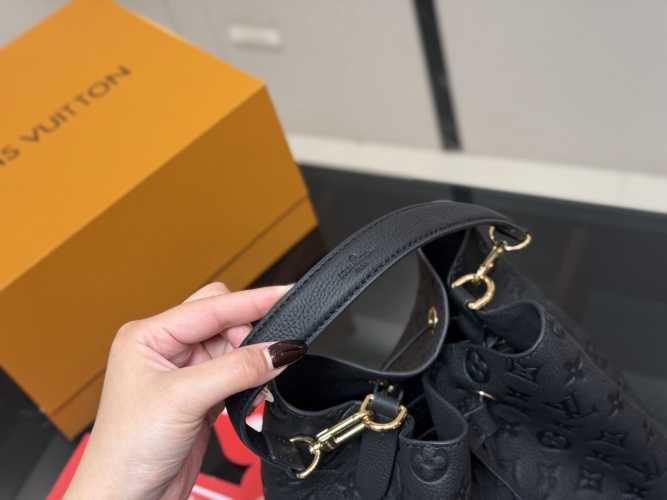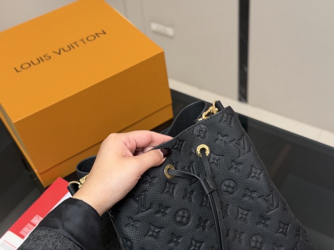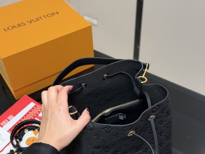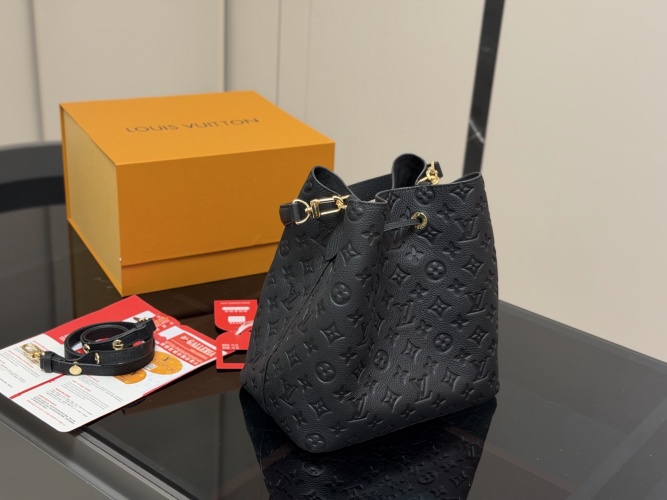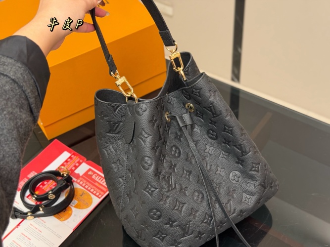 Tags: Black Designer Bag, Designer Bucket Bag, Embossed Leather Bag, Leather Crossbody Bag, Luxury Shoulder Bag, Lv Néonoe Bag