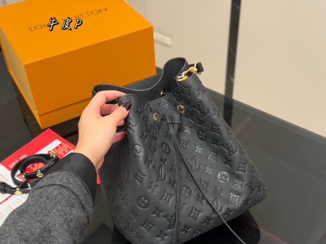 The LV Néonoé bucket bag features embossed leather and gold-tone hardware. It's a versatile choice for crossbody or shoulder wear.