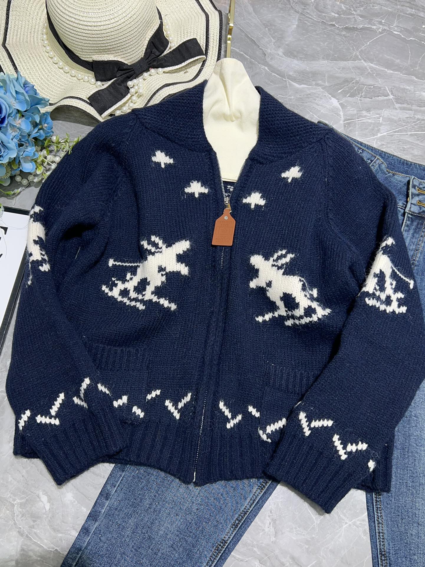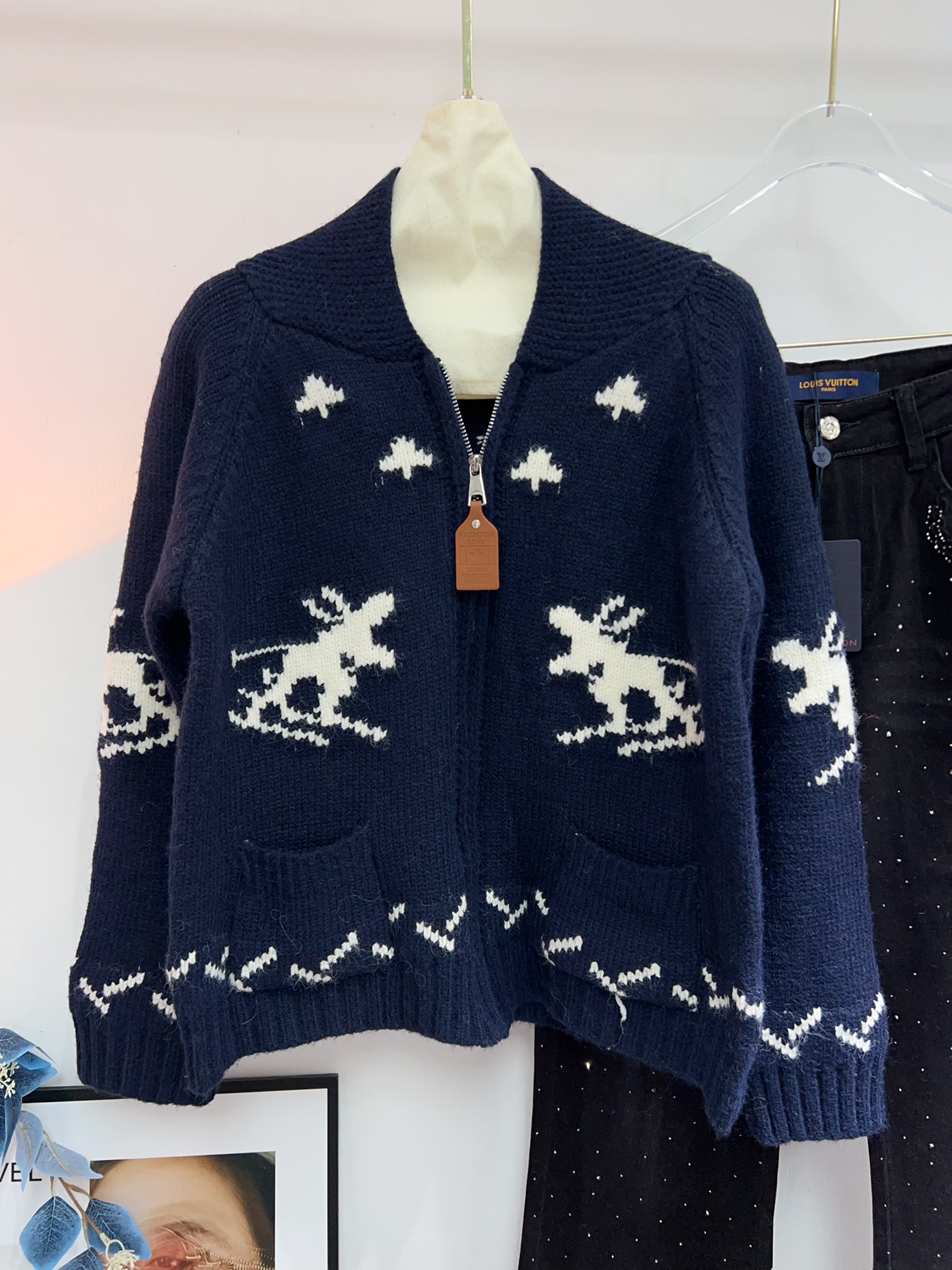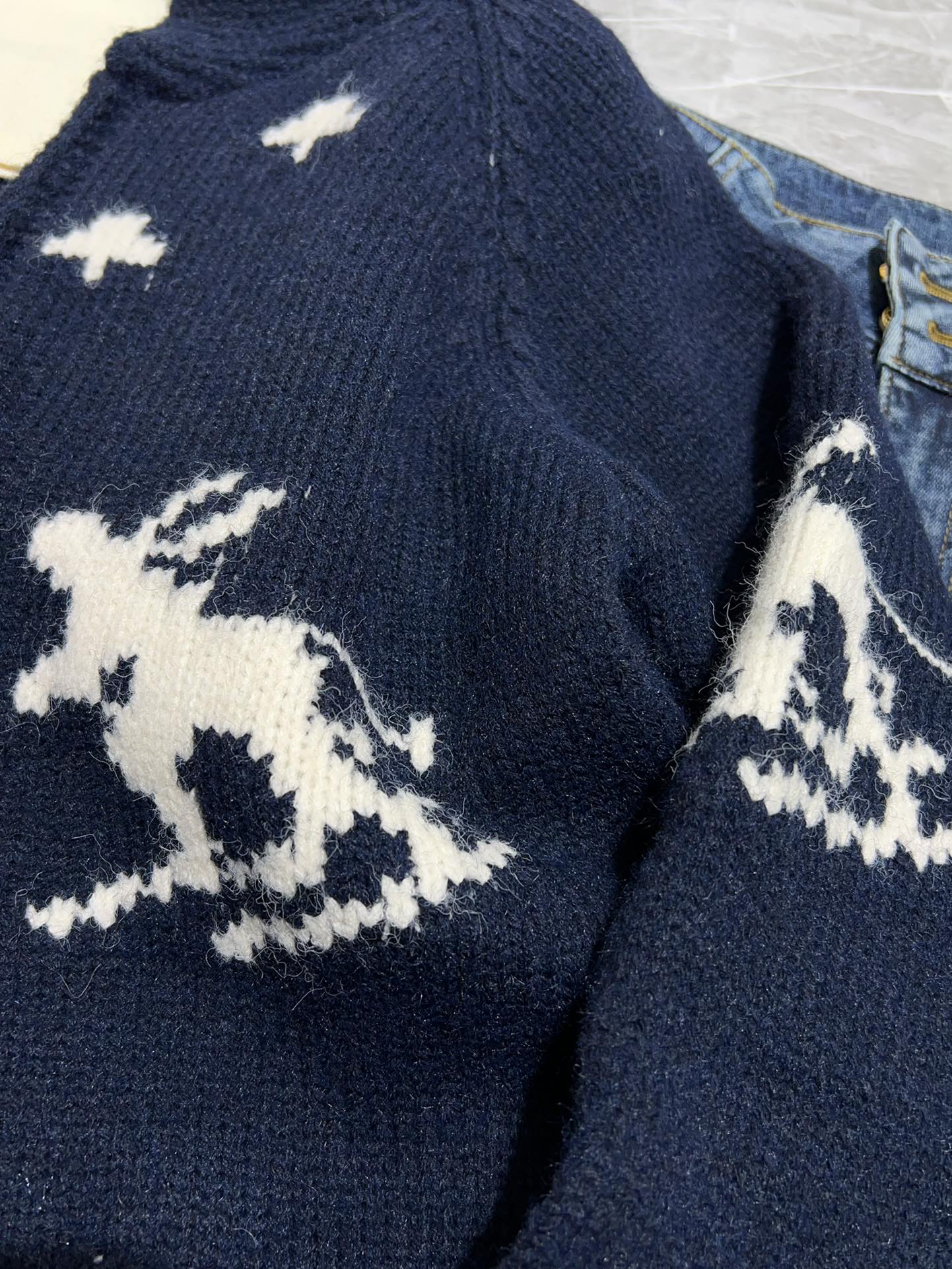 Elevate your winter style with this Louis Vuitton-inspired knitted cardigan featuring a charming reindeer pattern. Soft, warm, and perfect for layering.