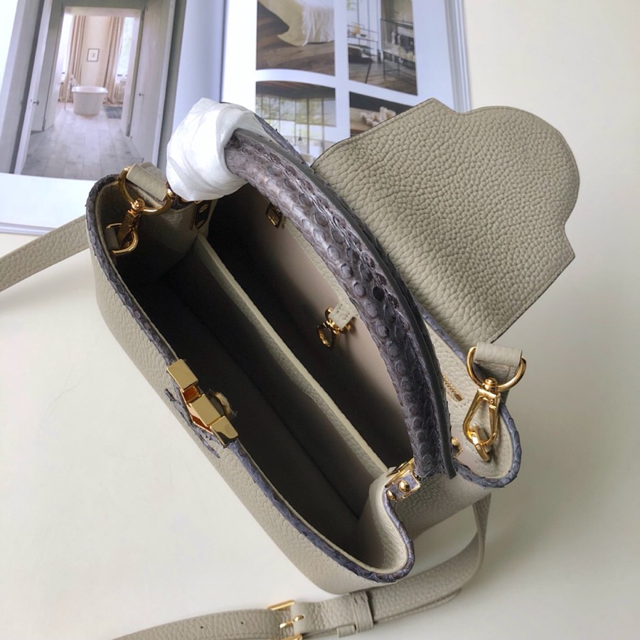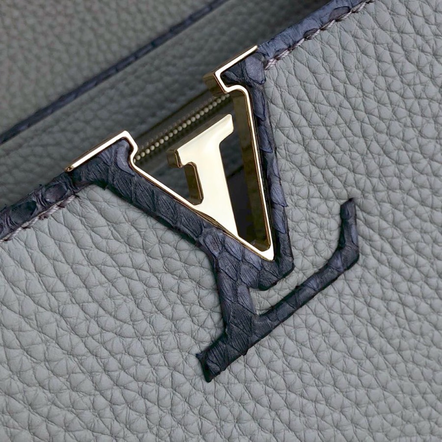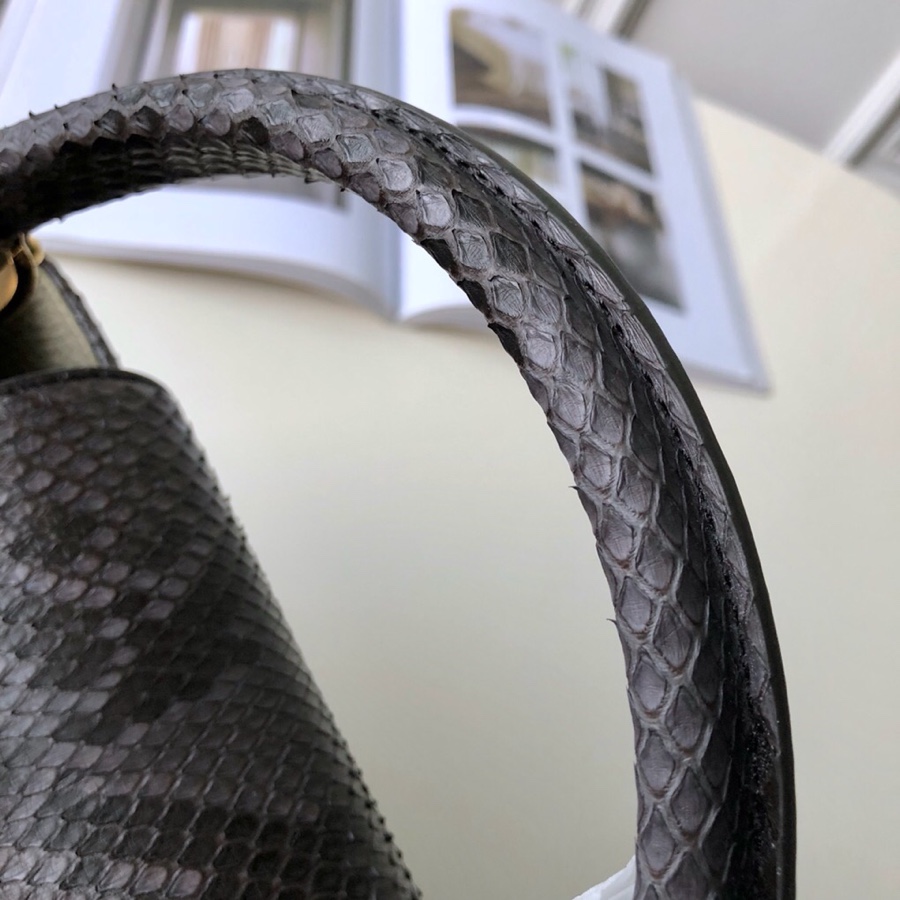 This Capucines small handbag selected python skin to decorate the permanent black Taurillon leather.The exotic python pattern is wrapped in the corner of the LV letter, spreading to the surface layer of the flip, outlines the elegant outline of the Capucines handbag opening and closing.The handle is fixed in a ring, and the golden nail is inlaid.Size 27.0 x 18.0 x 9.0 cm.