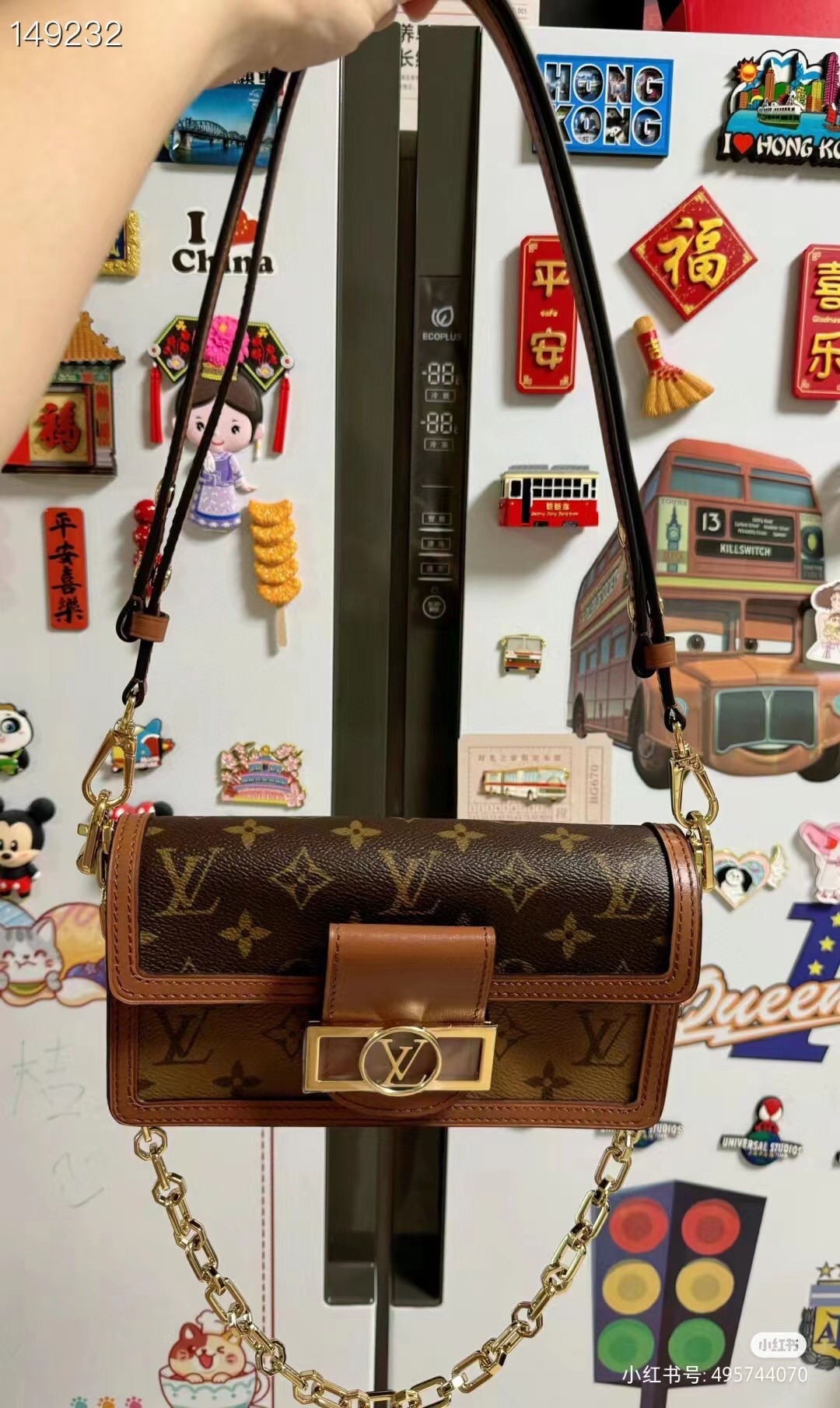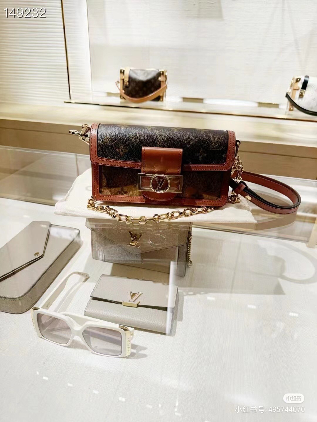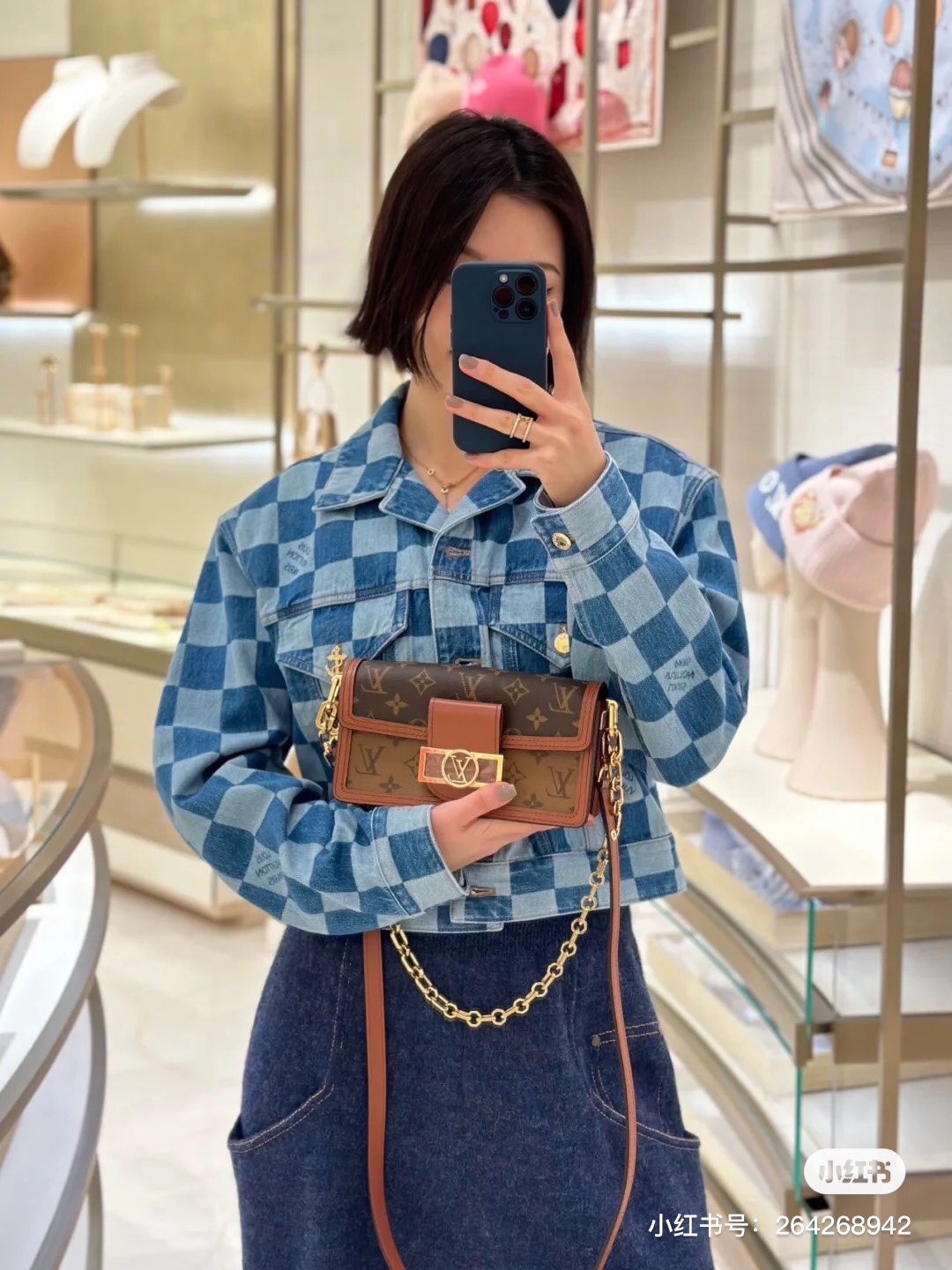 Daphne's current Dauphine East West handbag combines classic Monogram and Monogram Reverse canvas, with a slender configuration built with the brand's signature character, cleverly echoing the rectangular outline of the Dauphine LV lock. With the clever use of the detachable leather shoulder strap and chain, you can switch between carrying styles at will.