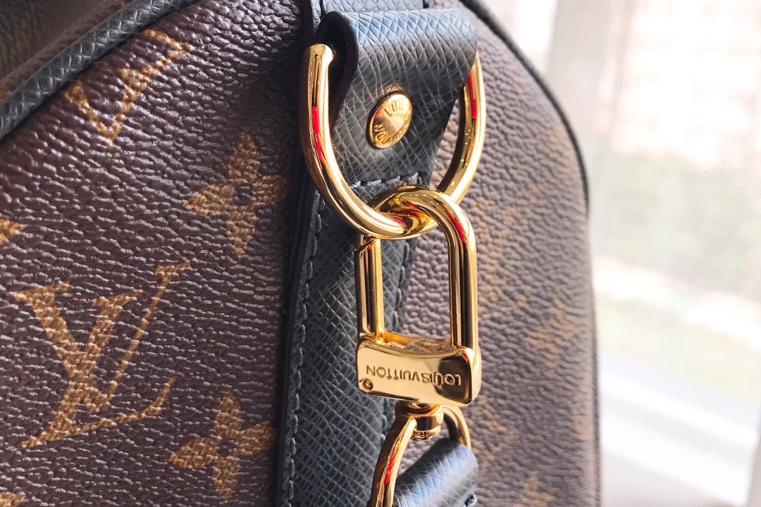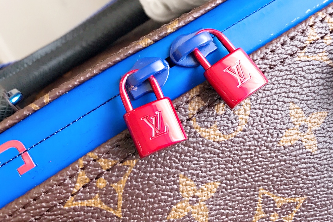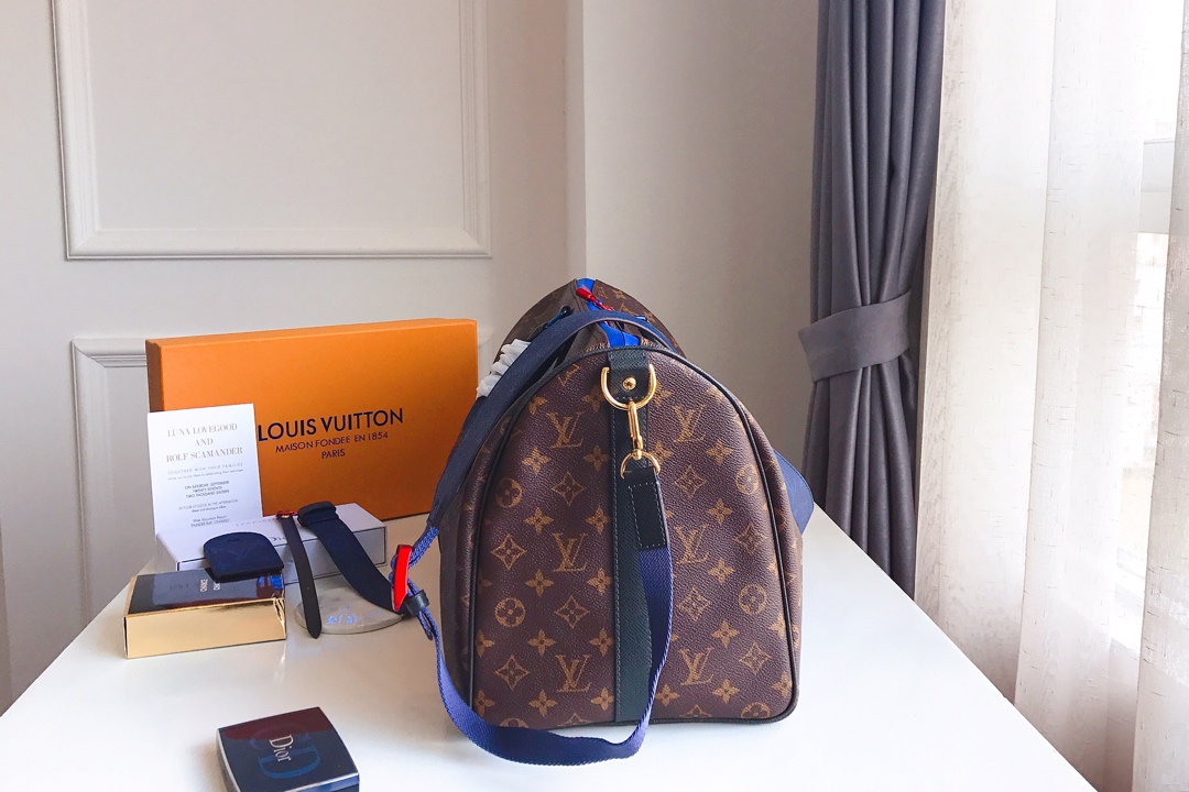 The Keepall 45 bag is made of Damier Graphite canvas and is hand luggage size. It has a unique rounded leather handle and an adjustable and detachable shoulder strap. The shoulder pads on the shoulder strap make it more comfortable to carry. Original imported leather, vacuum electroplated hardware. Boston bag, presbyopic blue stripe travel bag M43858 Size: 45x 27x 20cm HM005011PL