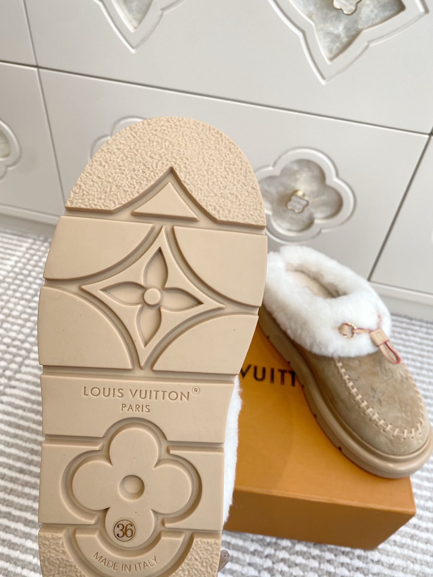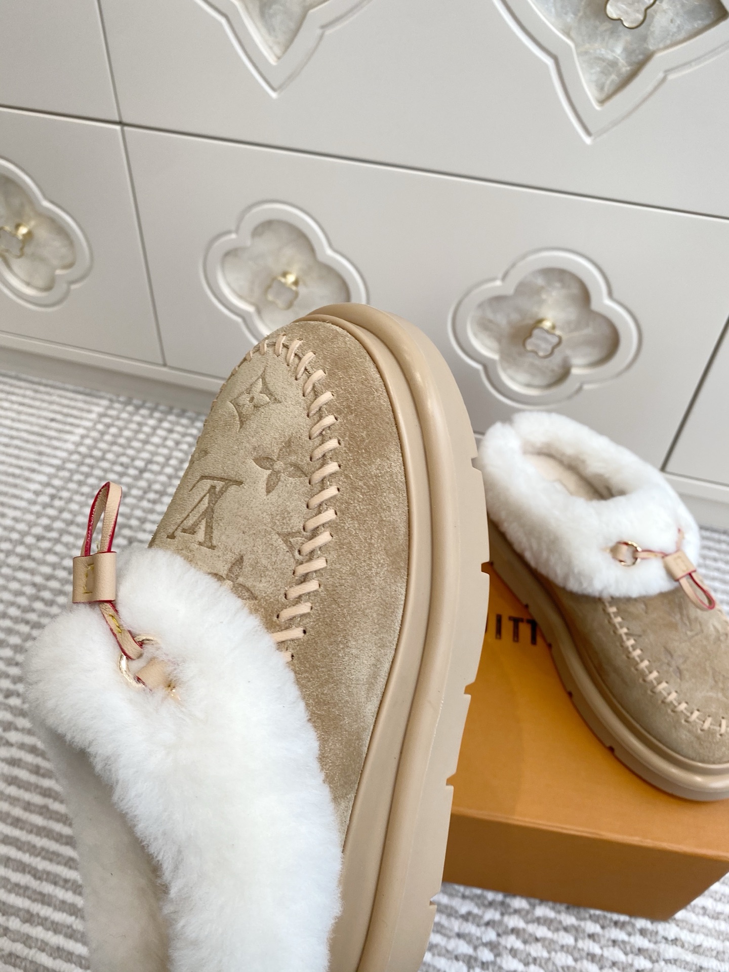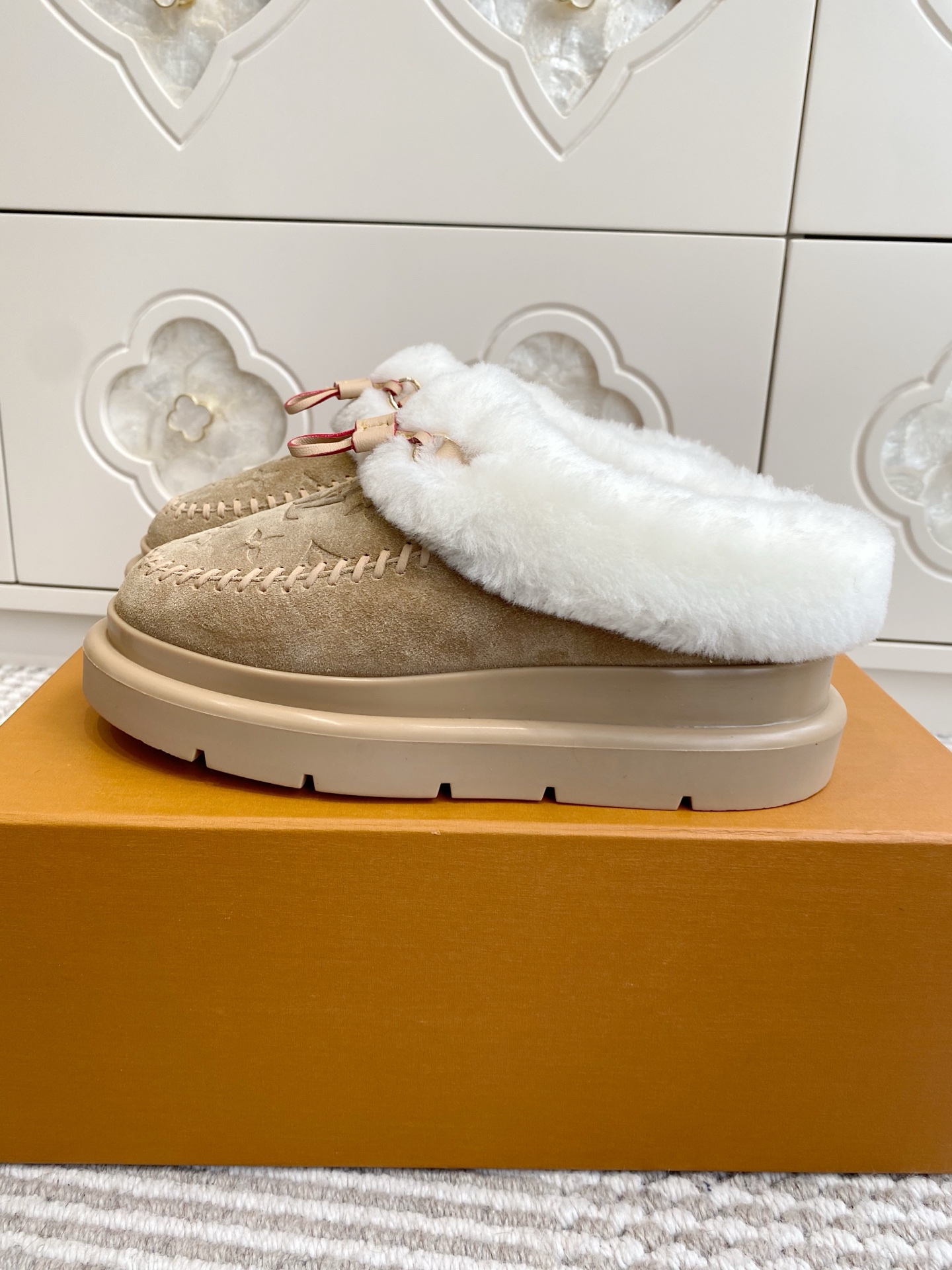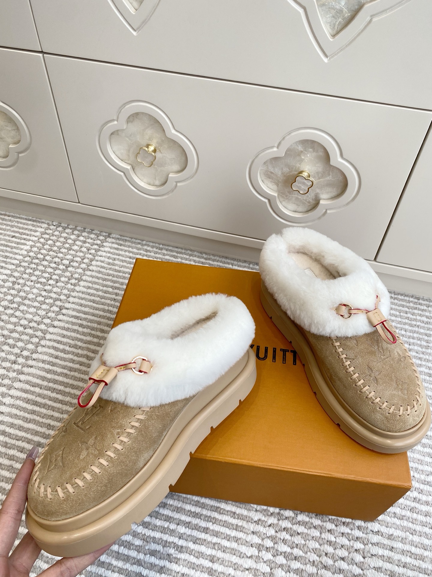 Tags: Comfortable Mules, Designer Mules, Louis Vuitton Mules, Luxury Footwear, Shearling Mules, Suede Slippers