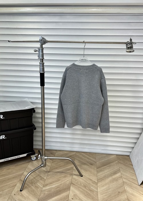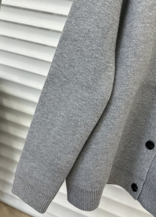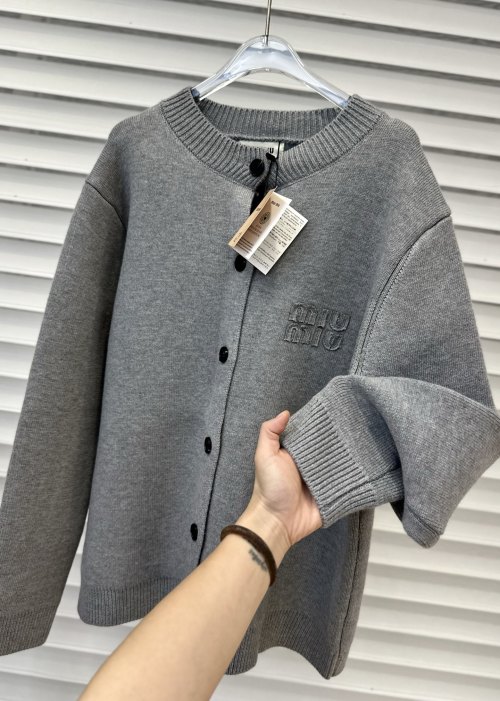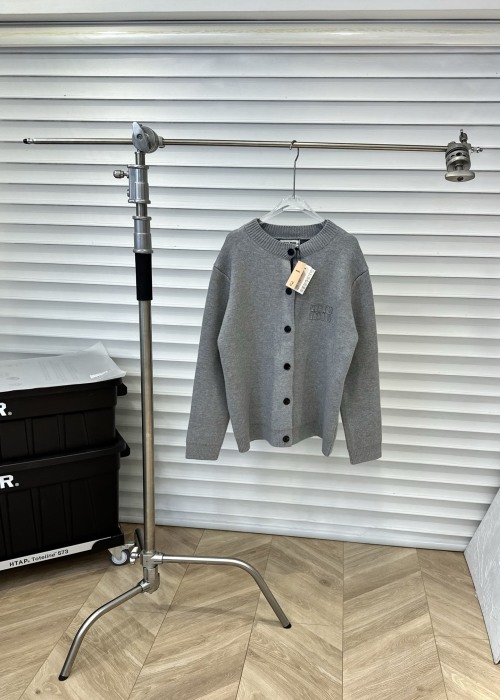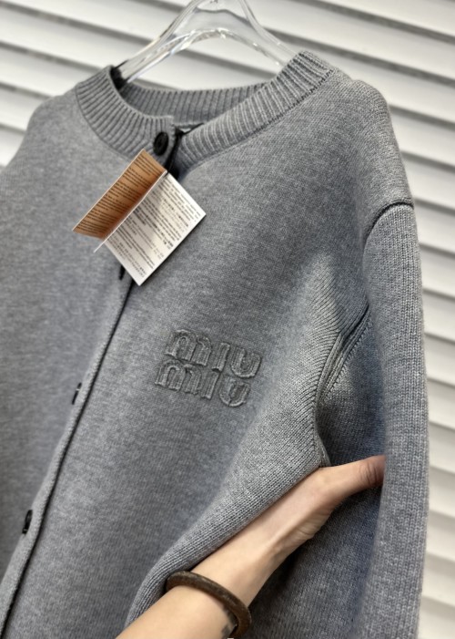 Tags: Button Down Cardigan, Designer Cardigan, Gray Knit Cardigan, Logo Applique Cardigan, Miu Miu Cardigan, Wool Blend Knitwear