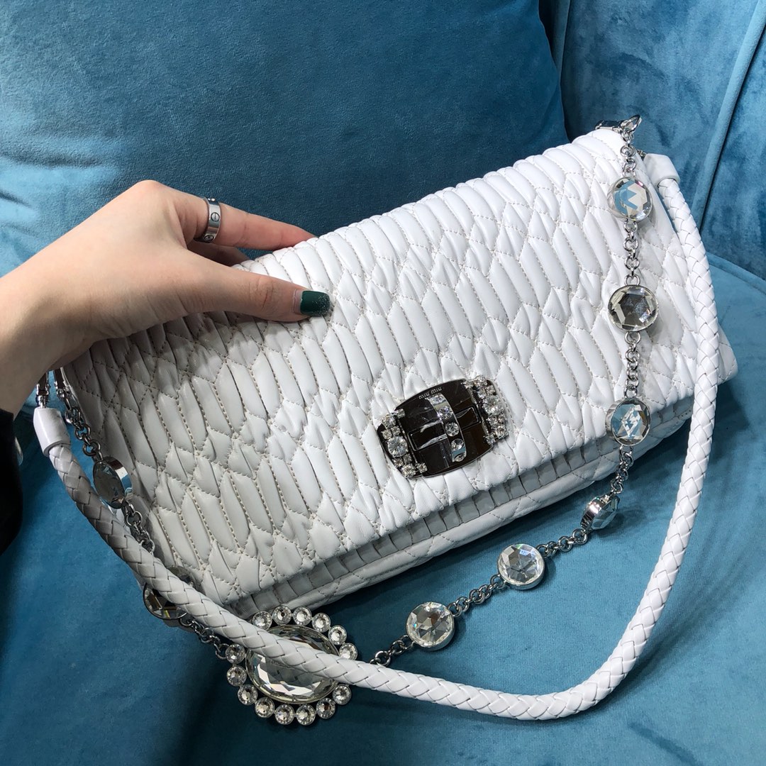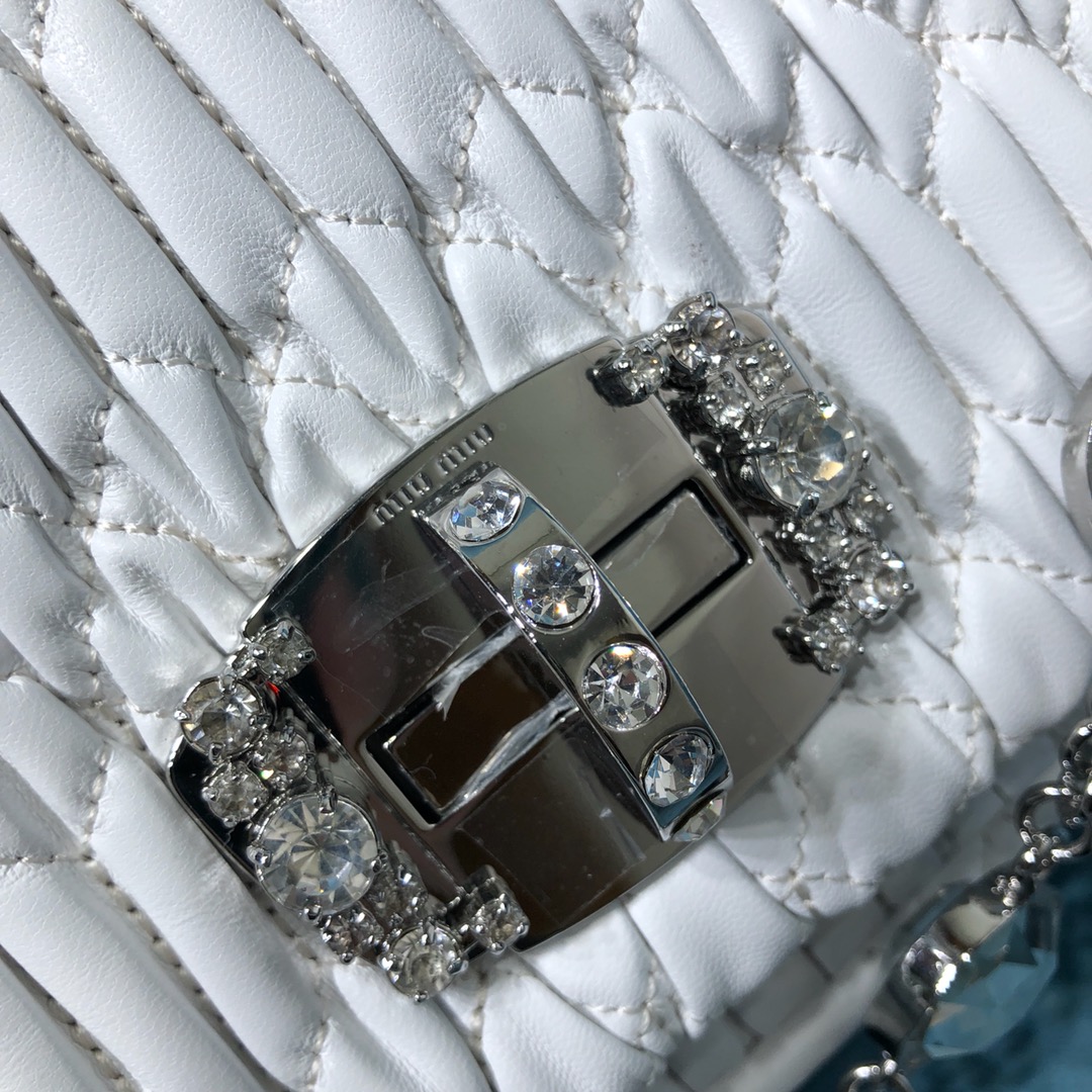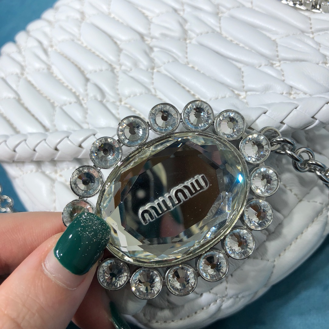 Brand new upgrade 🔥 Gemstone chain bag 💎💎 Brand new upgraded version, counter 1:1, made of imported lambskin, super soft 👊🏿👊🏿 diamond chain ⛓⛓ made of glass rhinestone crystal with miumiu logo printed on the front [emphasis added] There is no mark on the back of the crystal chain, only one side is marked] Model: 5BD233 Size: 28❌4❌15 1080089