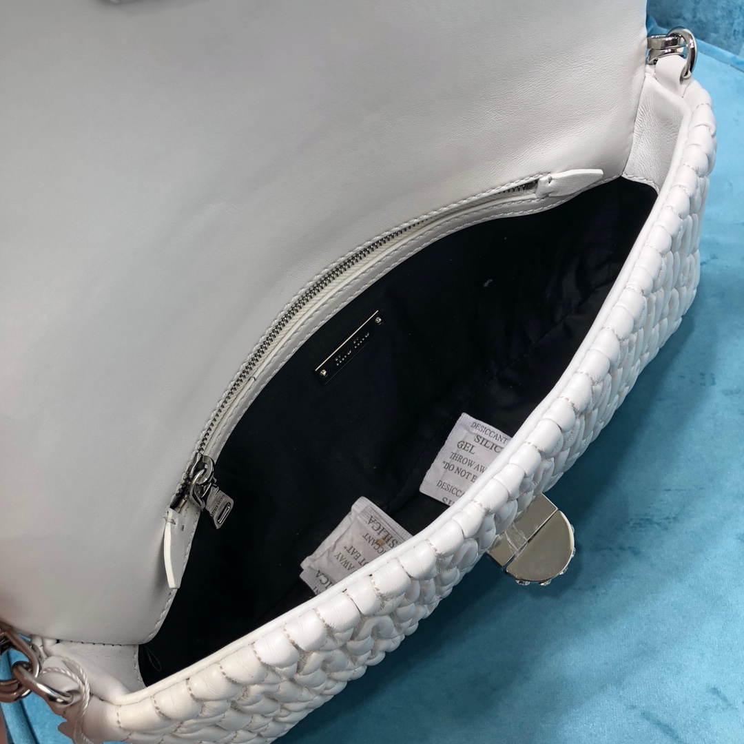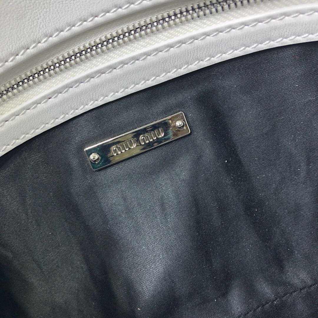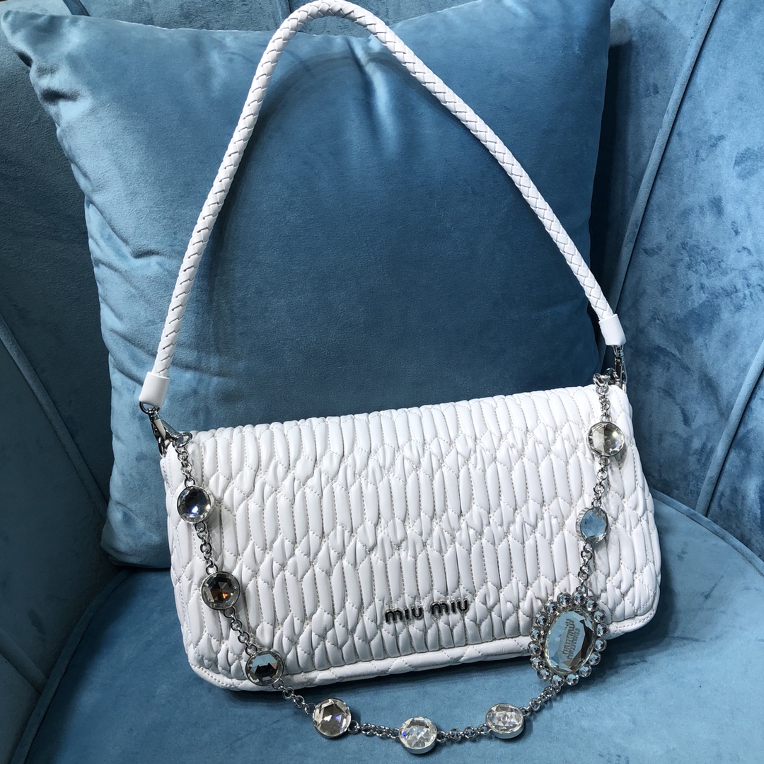 Brand new upgrade 🔥 Gemstone chain bag 💎💎 Brand new upgraded version, counter 1:1, made of imported lambskin, super soft 👊🏿👊🏿 diamond chain ⛓⛓ made of glass rhinestone crystal with miumiu logo printed on the front [emphasis added] There is no mark on the back of the crystal chain, only one side is marked] Model: 5BD233 Size: 28❌4❌15 1080089