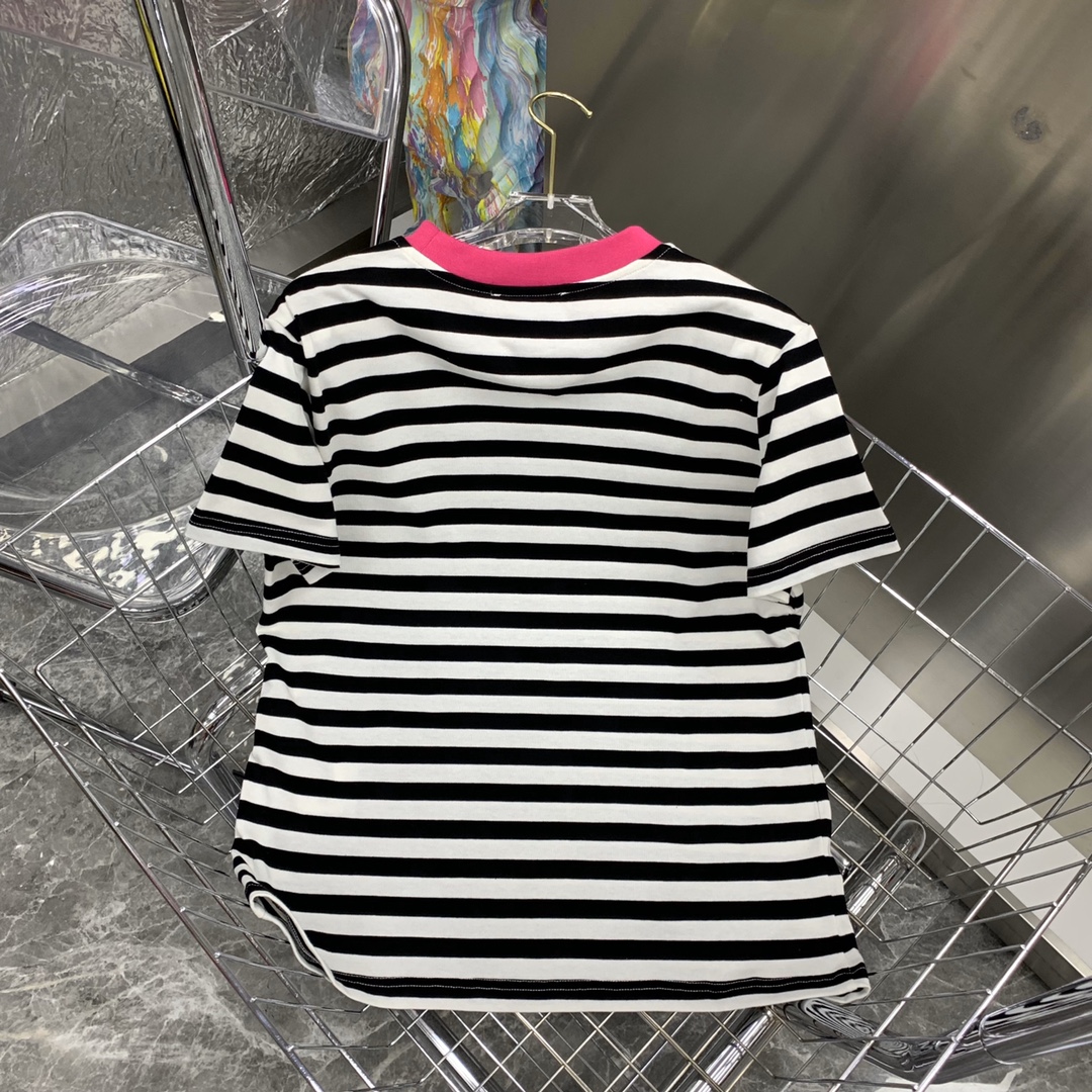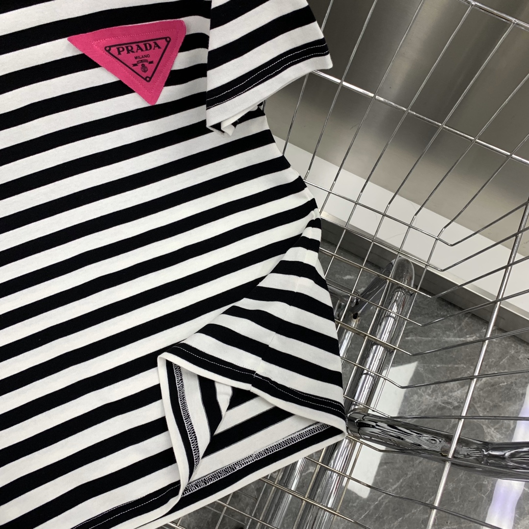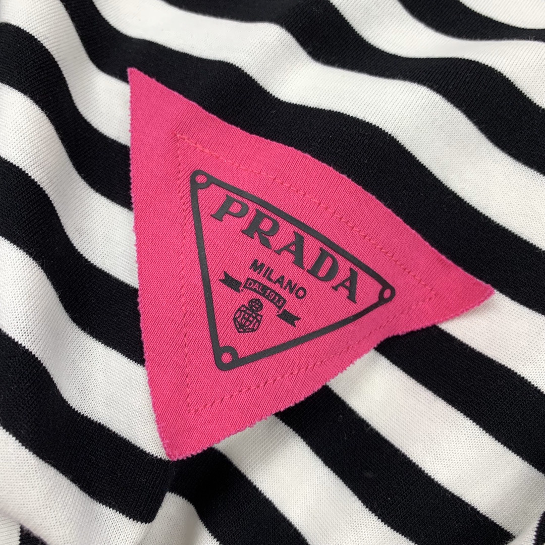 High-quality Prada2023 spring and summer new striped color-contrasting pink triangle letter T-shirt! SmL