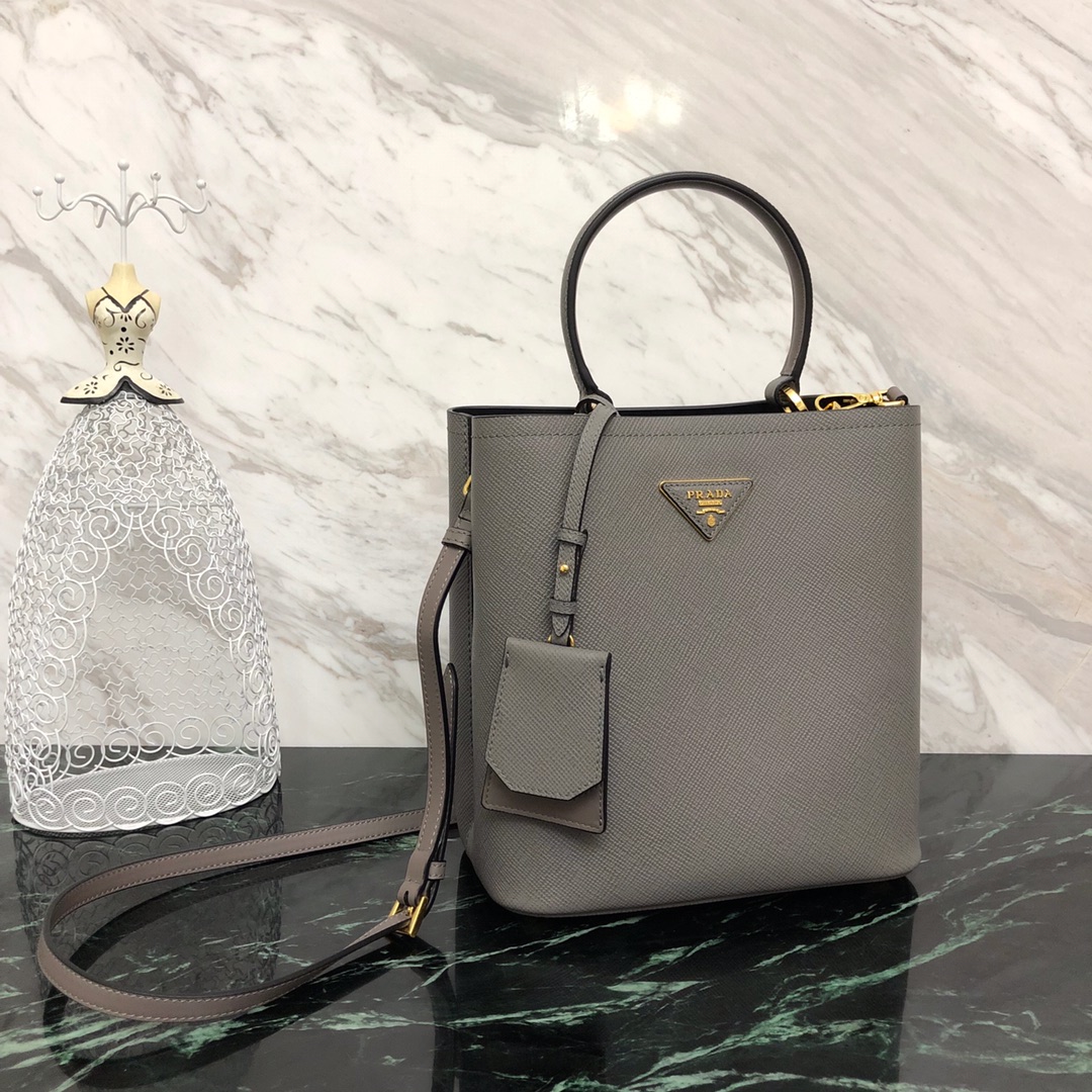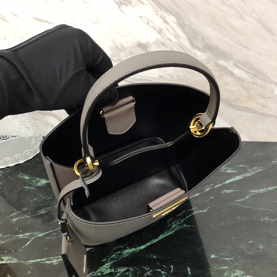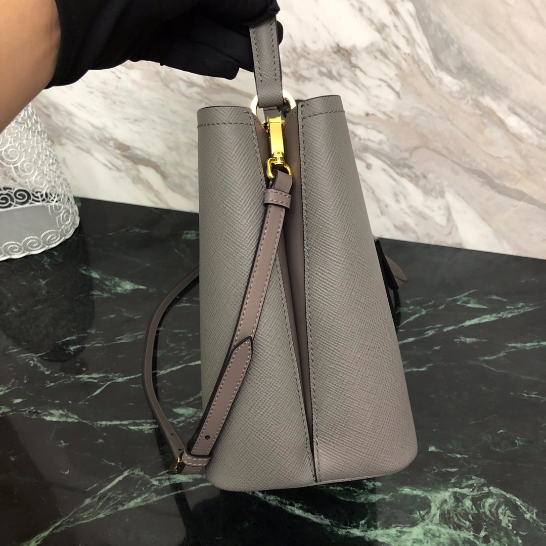 P's latest double handbag, bucket-shaped shopping bag, central pocket with covered magnetic buckle, very thoughtful design, fashionable and safe and convenient, contrasting color soft sheepskin lining, using the original Italian fragrance [strong] rough cross pattern, original
