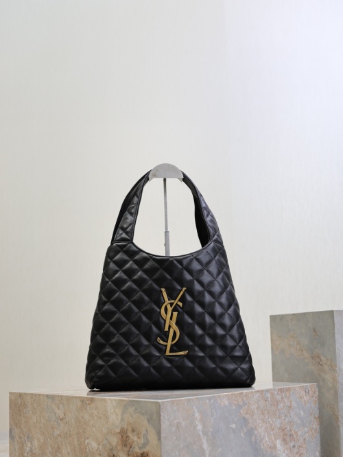 The Saint Laurent Icare shopping bag in black lambskin, featuring a quilted design, gold-tone hardware, and versatile carry options. Perfect for daily use!