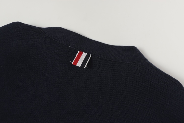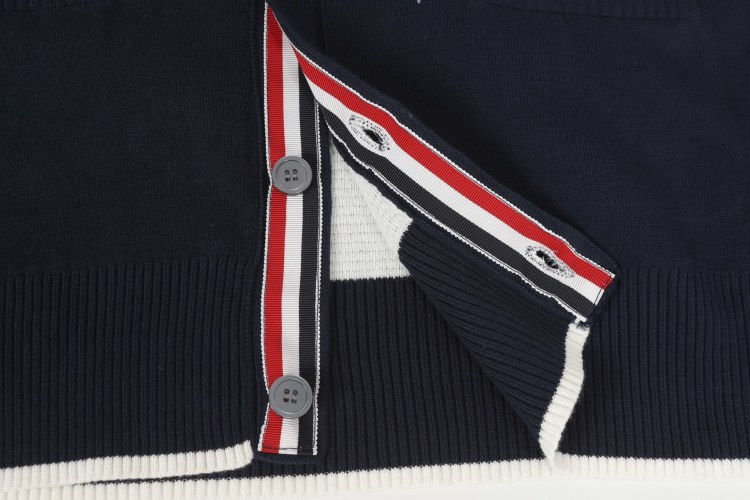 This Thom Browne navy cardigan combines timeless design with signature details, making it a versatile and stylish choice for any occasion.