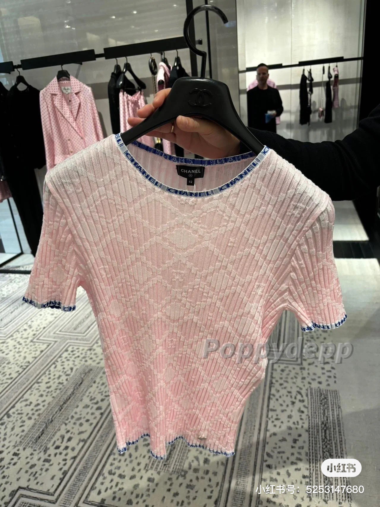 838290 Exclusive first release❤️Original quality Chane*24838 new product! Super tender cherry blossom 🌸 pink, ladylike letter crocheted short-sleeved top with contrasting edges, a beautiful little fairy's white and rich artifact! Contrast edge letter logo intarsia design, gold positioning