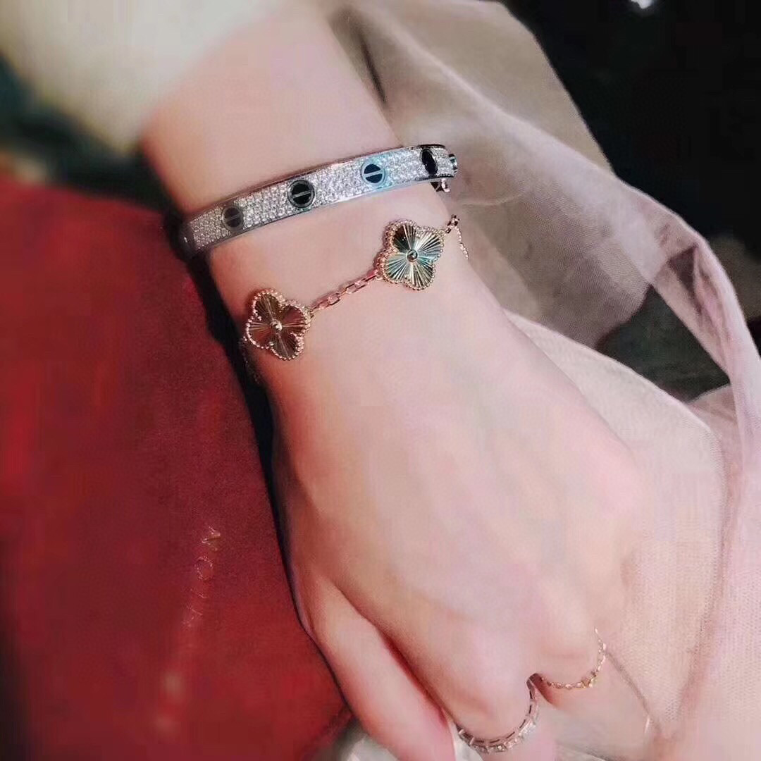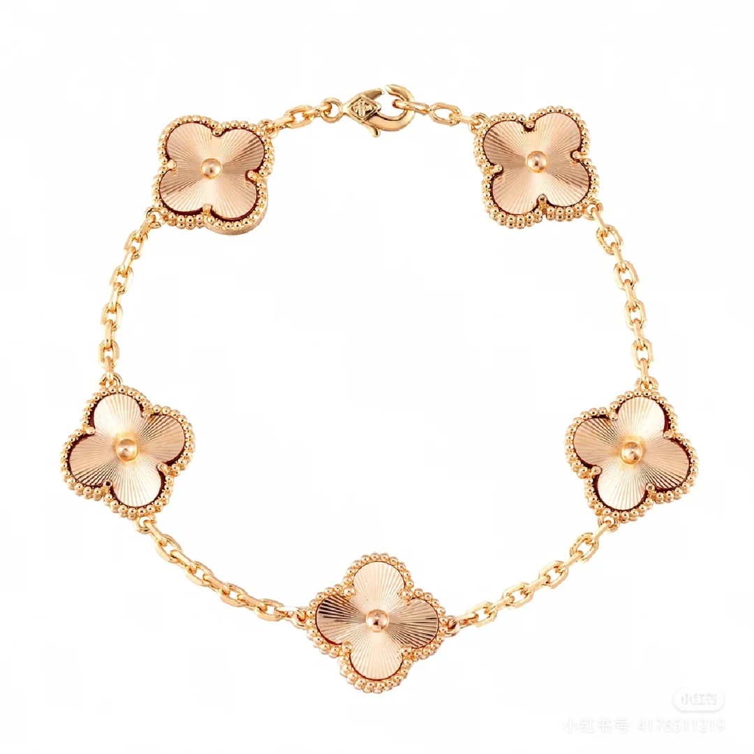 Elegant Van Cleef & Arpels clover bracelet featuring a laser-engraved design. Rose gold finish, perfect for couples. A luxurious and understated piece.
