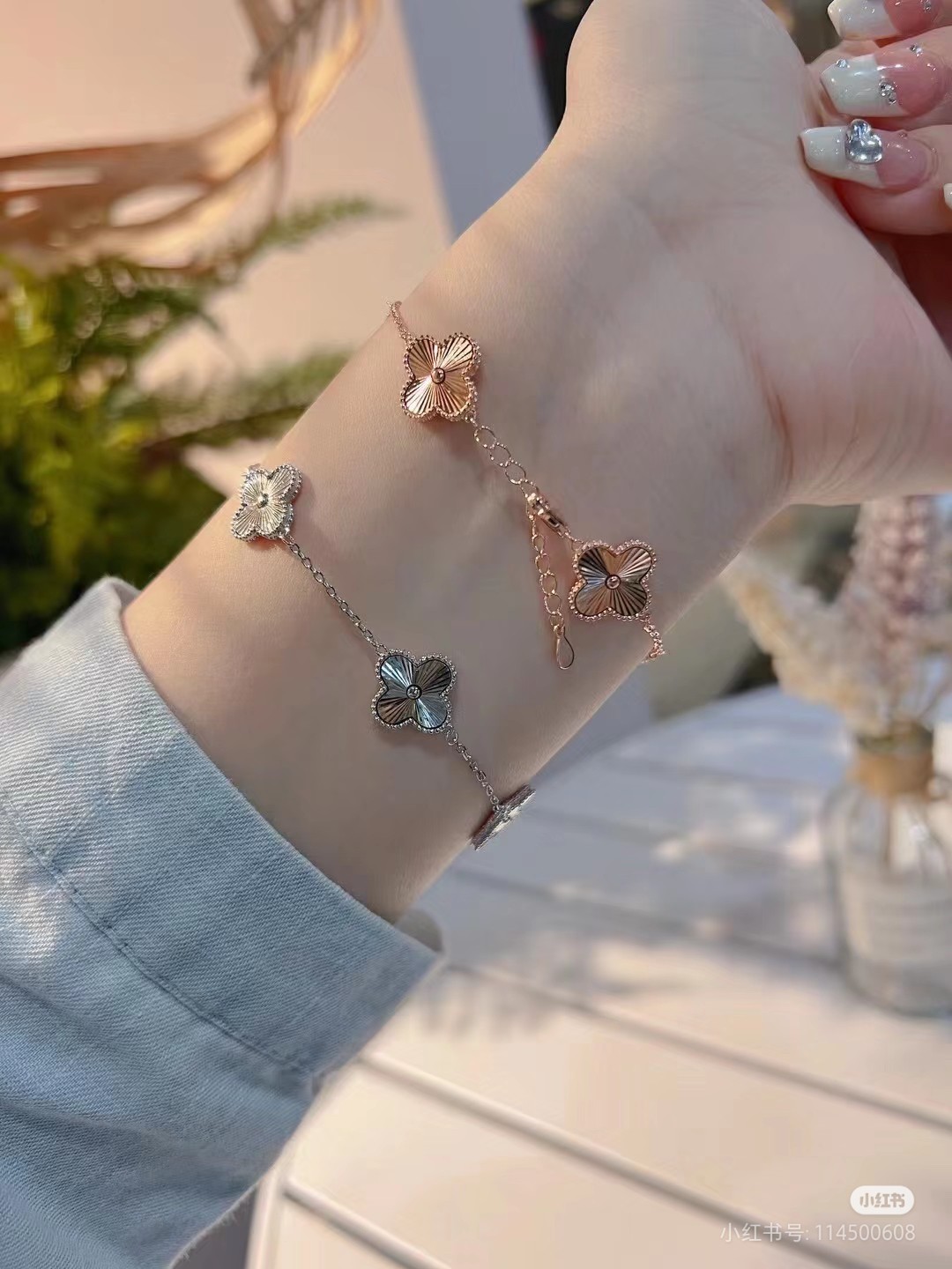 Tags: Designer Clover Jewelry, Elegant Rose Gold Jewelry, Laser Engraved Bracelet, Luxury Women's Bracelet, Rose Gold Clover Bracelet, Van Cleef Arpels Bracelet